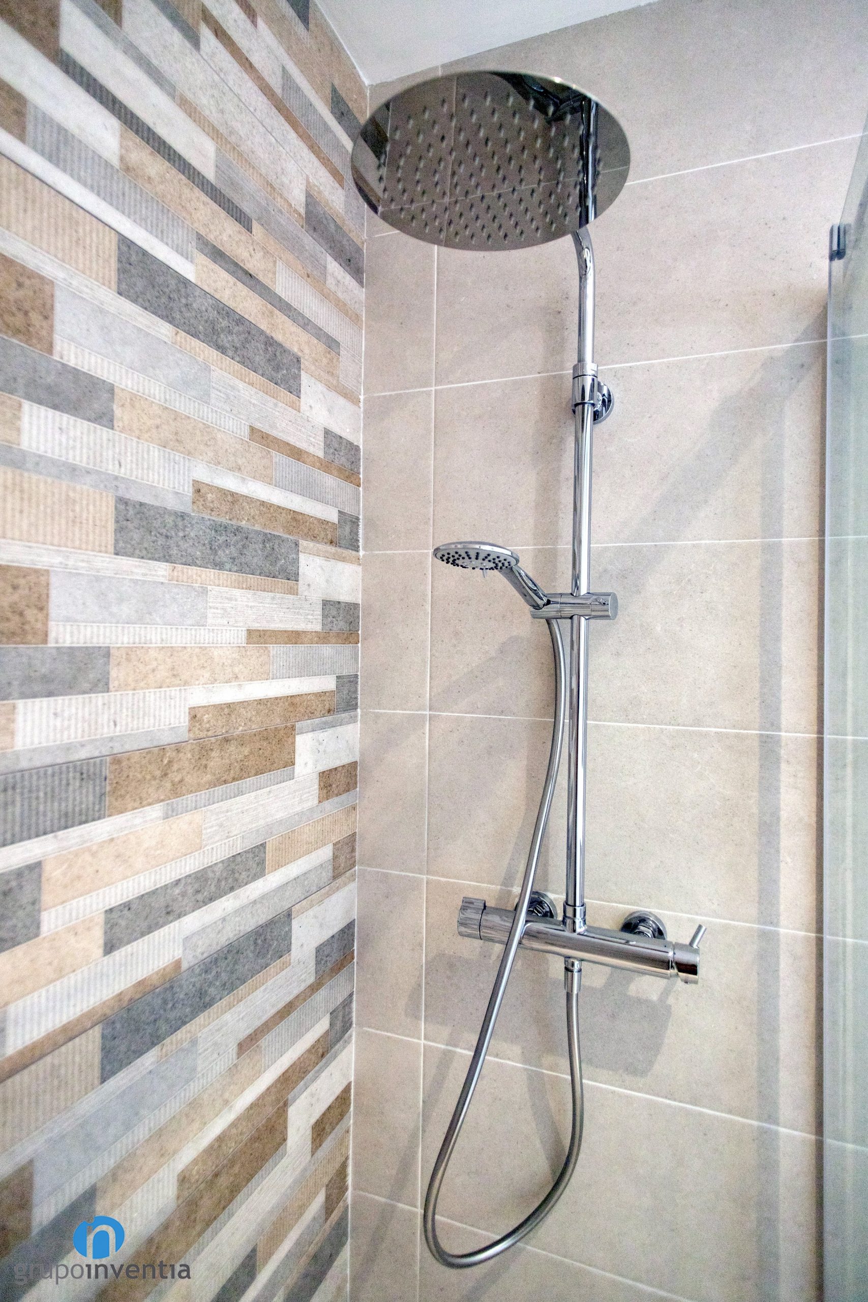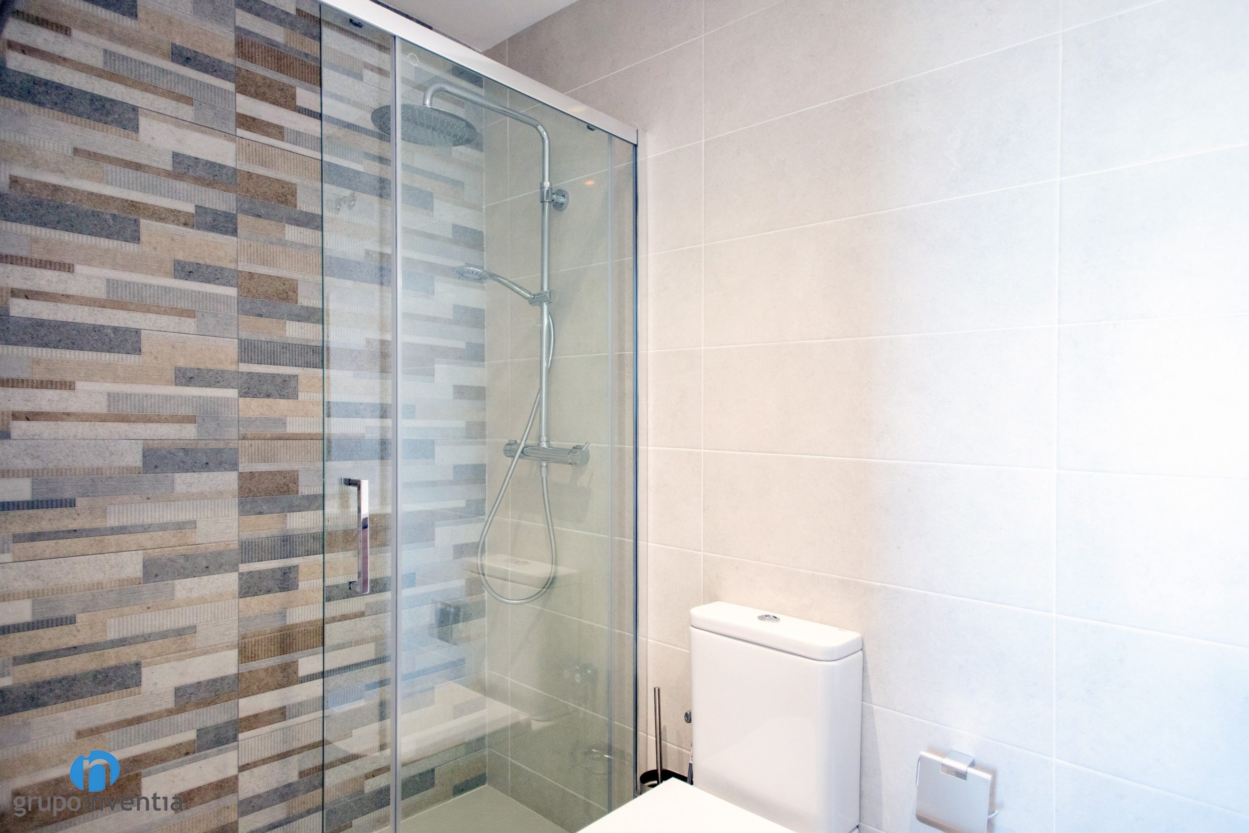 Otro espacio que ha visto mejorada su imagen y equipamiento en esta reforma integral en Barcelona es el cuarto de baño. Las paredes se han alicatado con azulejos beige, consiguiendo una estancia fresca y luminosa. En la pared de la ducha se han utilizado azulejos rectangulares de diferentes tonalidades.