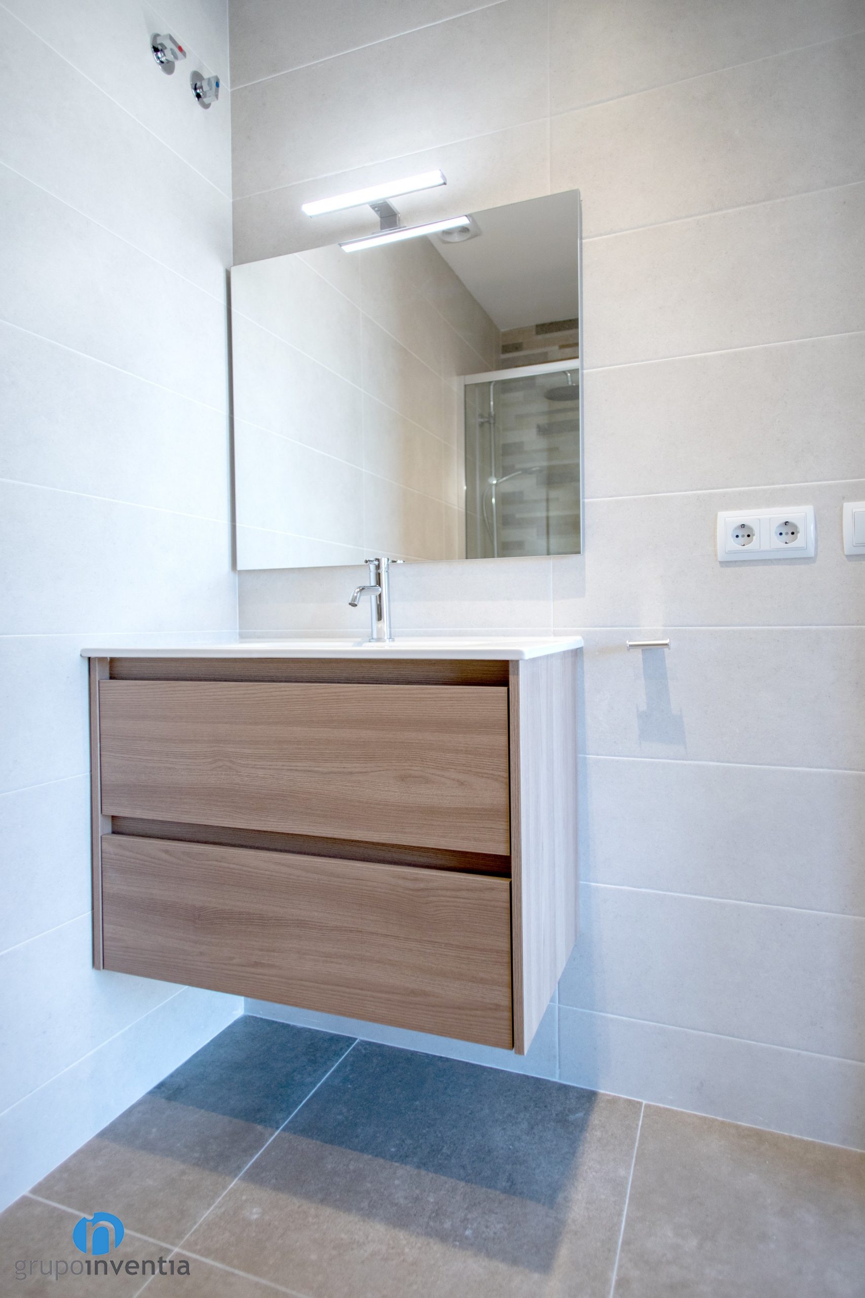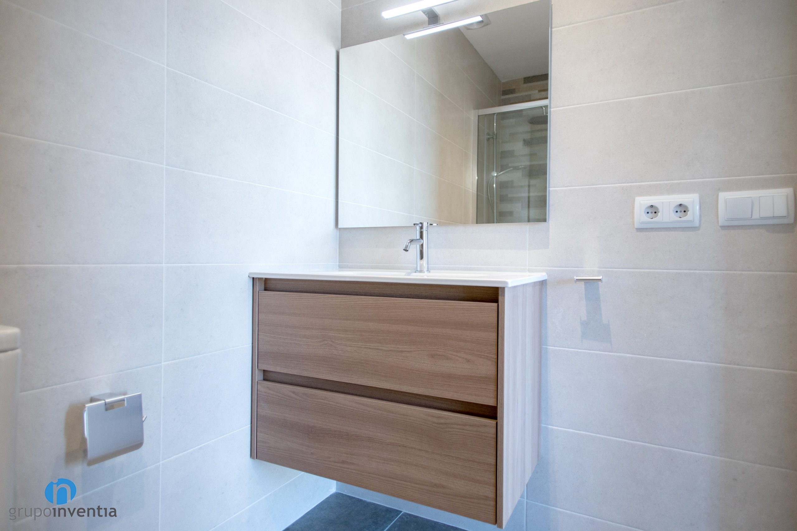 Para el equipamiento sanitario se ha pensado en un baño de tres piezas. Práctico y funcional. Así tenemos un lavabo con mueble de almacenaje incorporado, un inodoro y un plato de ducha. Éste último se ha protegido con mamparas de puertas correderas transparentes. El nuevo pavimento es un suelo de gres en tono amarronado. Encaja perfecta mente a nivel visual y se trata de una superficie sencilla de mantener.