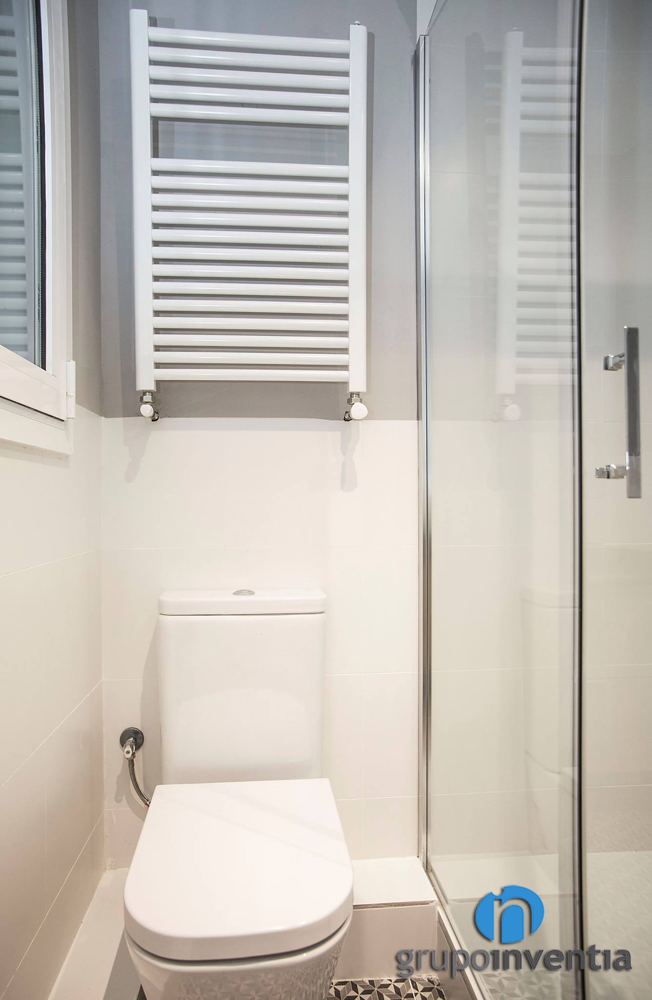El cuarto de baño ofrece una imagen muy neutra y fresca. Sus paredes se alicataron a media altura con azulejos blancos, mientras que el resto se pintó de gris. El diseño interior lo completa un pavimento hidráulico que encaja perfectamente con los demás elementos de esta reforma de baño.