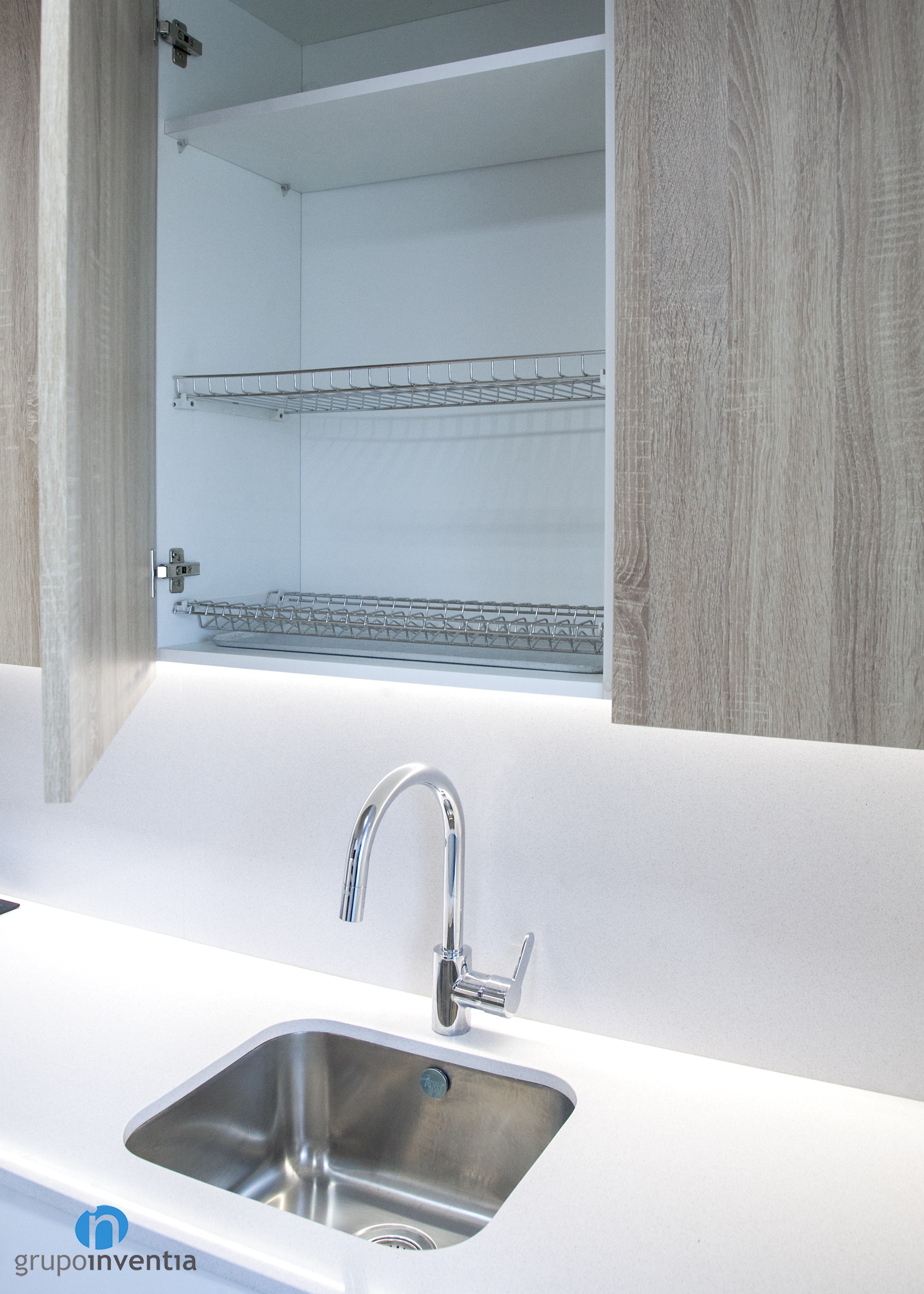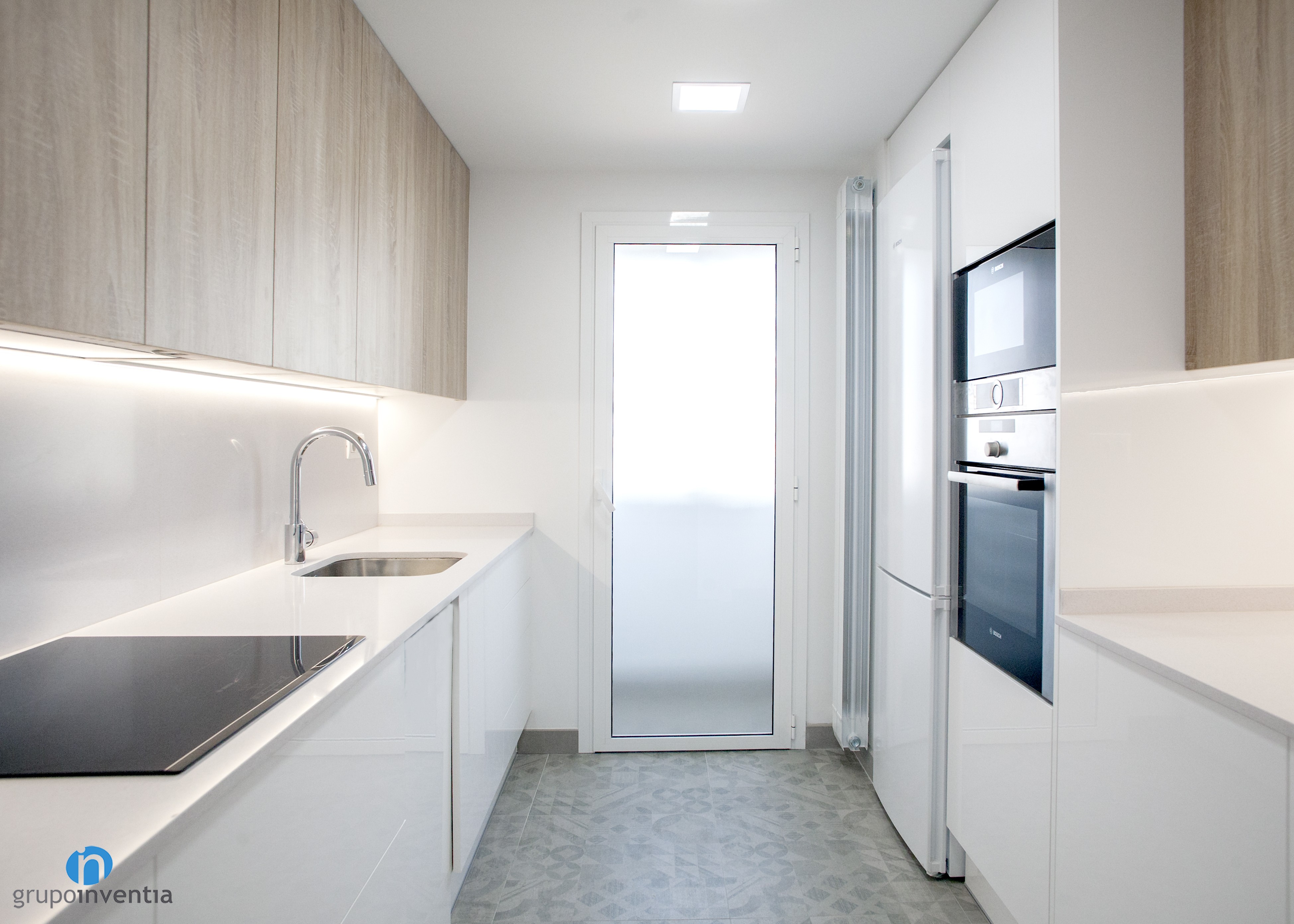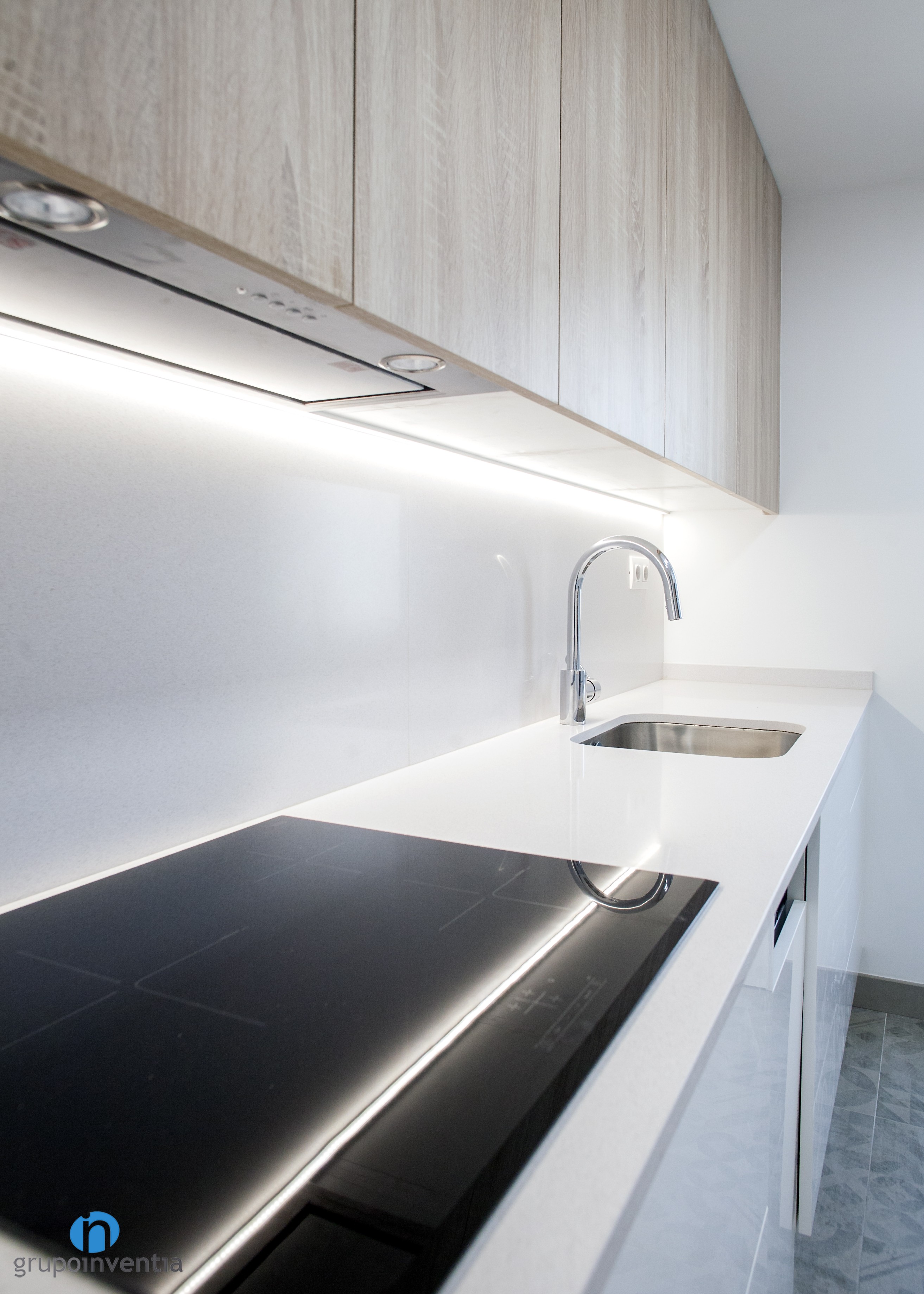 En la parte izquierda se colocó una alargada encimera equipada con una placa vitrocerámica y un fregadero individual. A su vez, esta zona amplía la capacidad de almacenaje con cajones y armarios tanto en la parte inferior como superior de la encimera. Una estancia en la que se utilizaron tonos neutros y se generó un espacio muy luminoso.