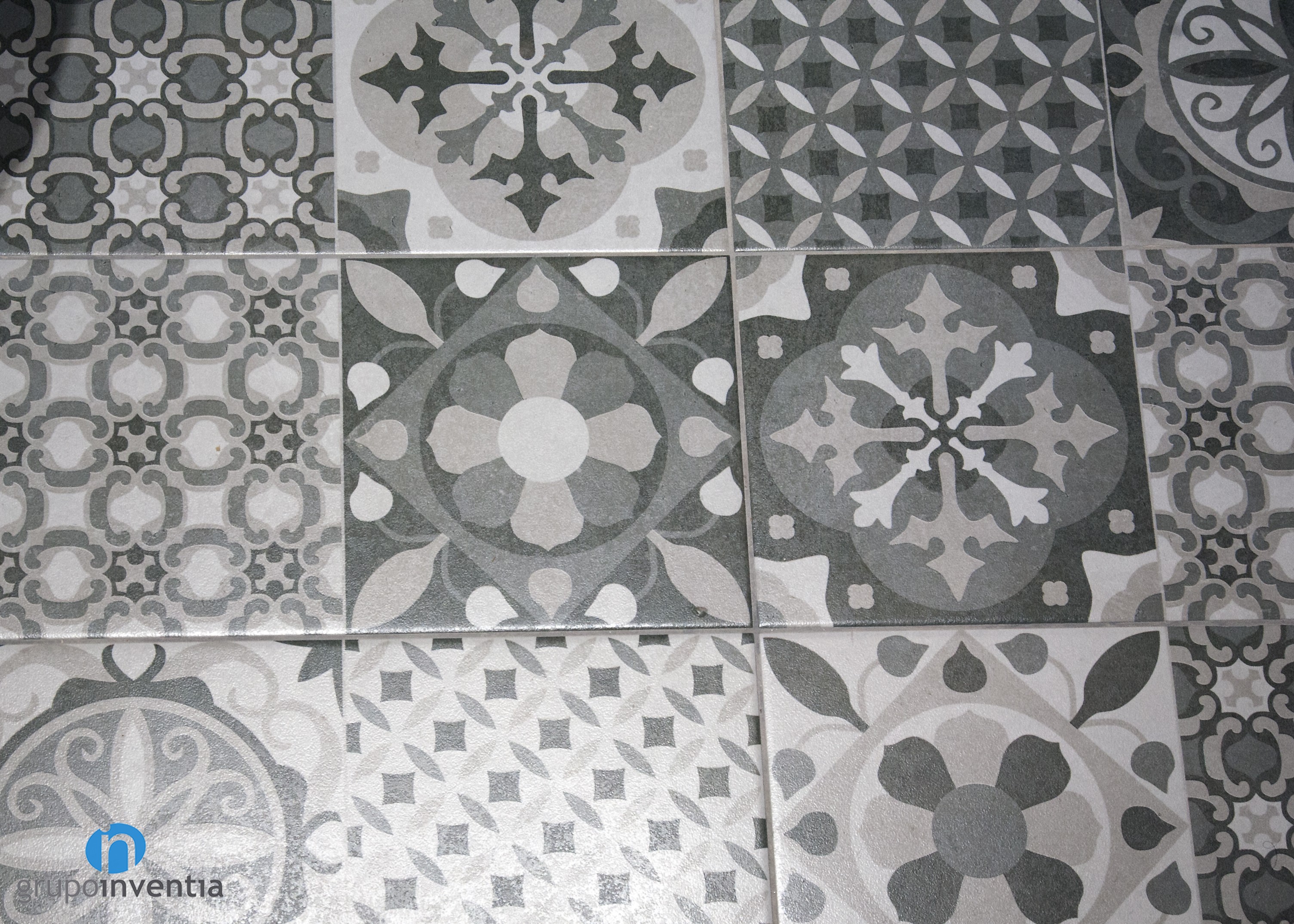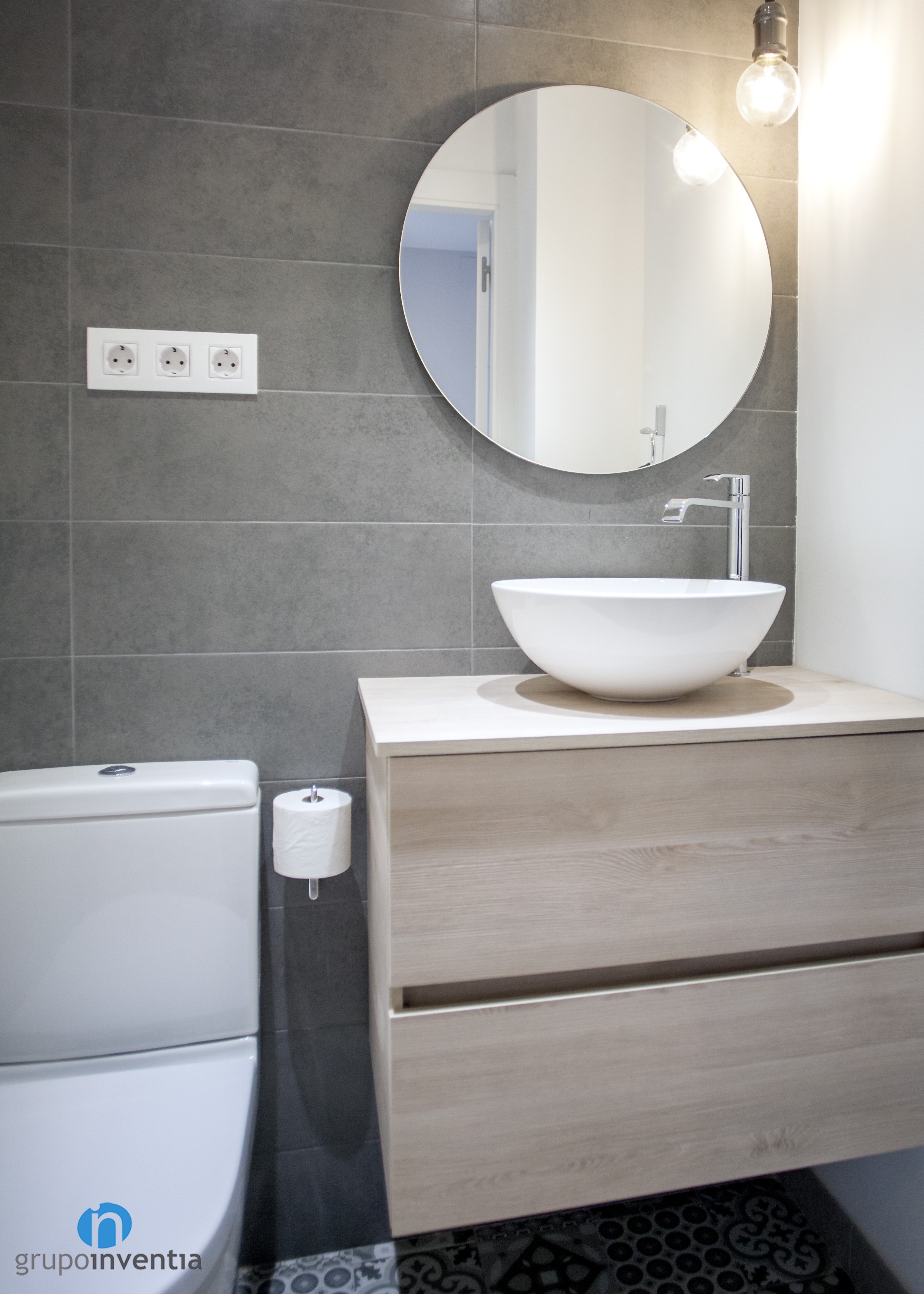 Por su parte, el baño de cortesía también dispone de tres piezas sanitarias: lavabo, inodoro y ducha, en este caso. En esta estancia se combinaron las paredes pintadas de blanco y otras alicatadas con azulejos grises, creando un contraste muy interesante. Aún así, la personalidad la aporta el pavimento hidráulico que se instaló.