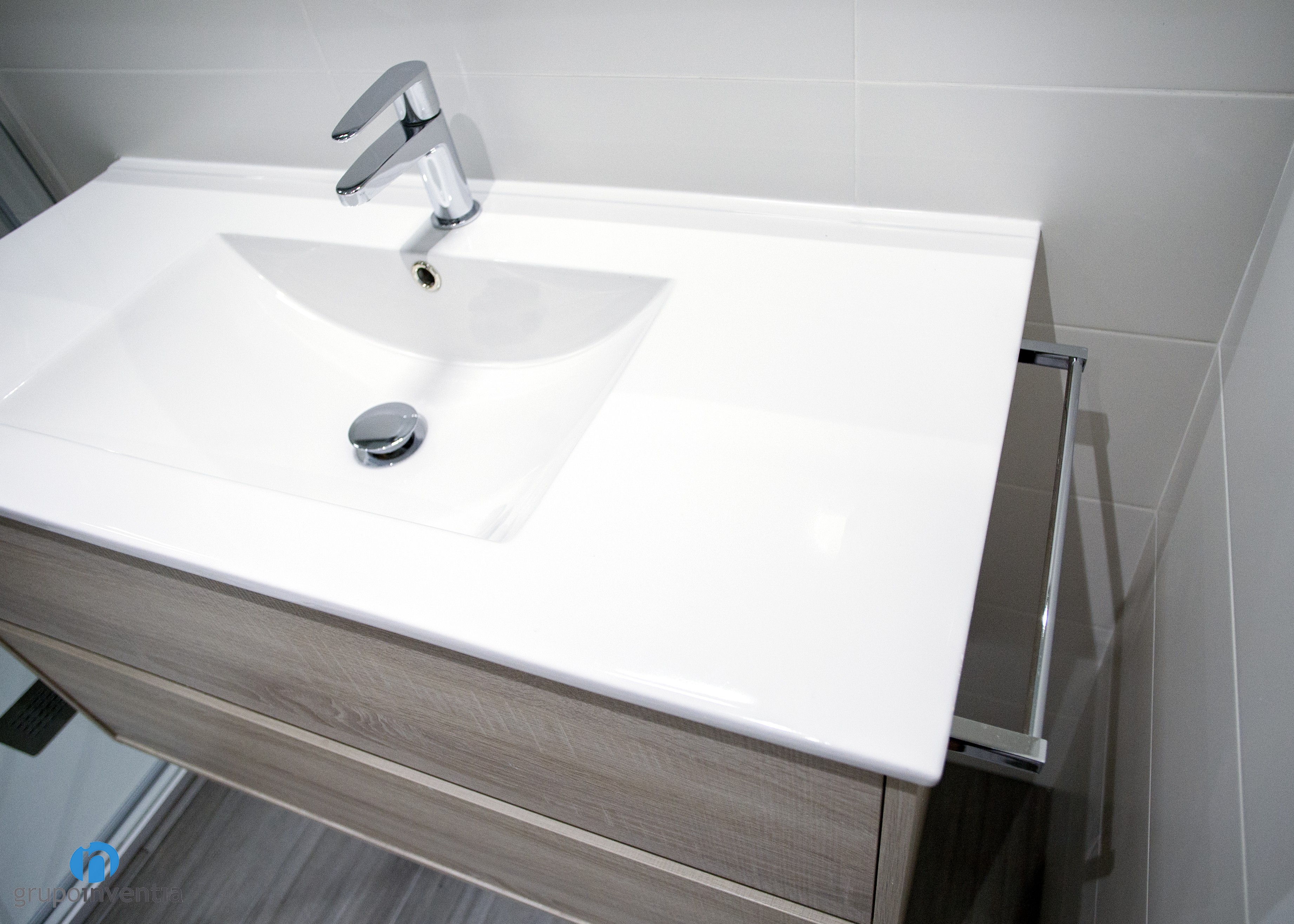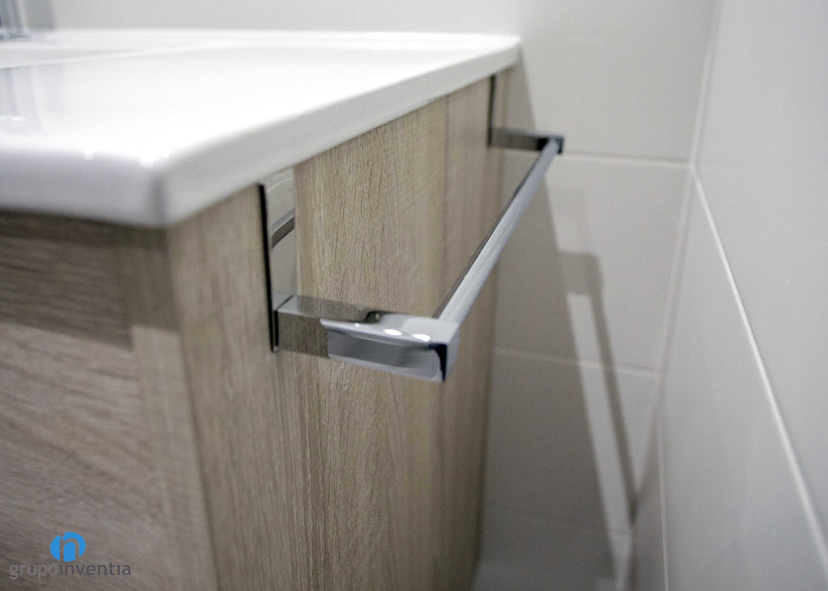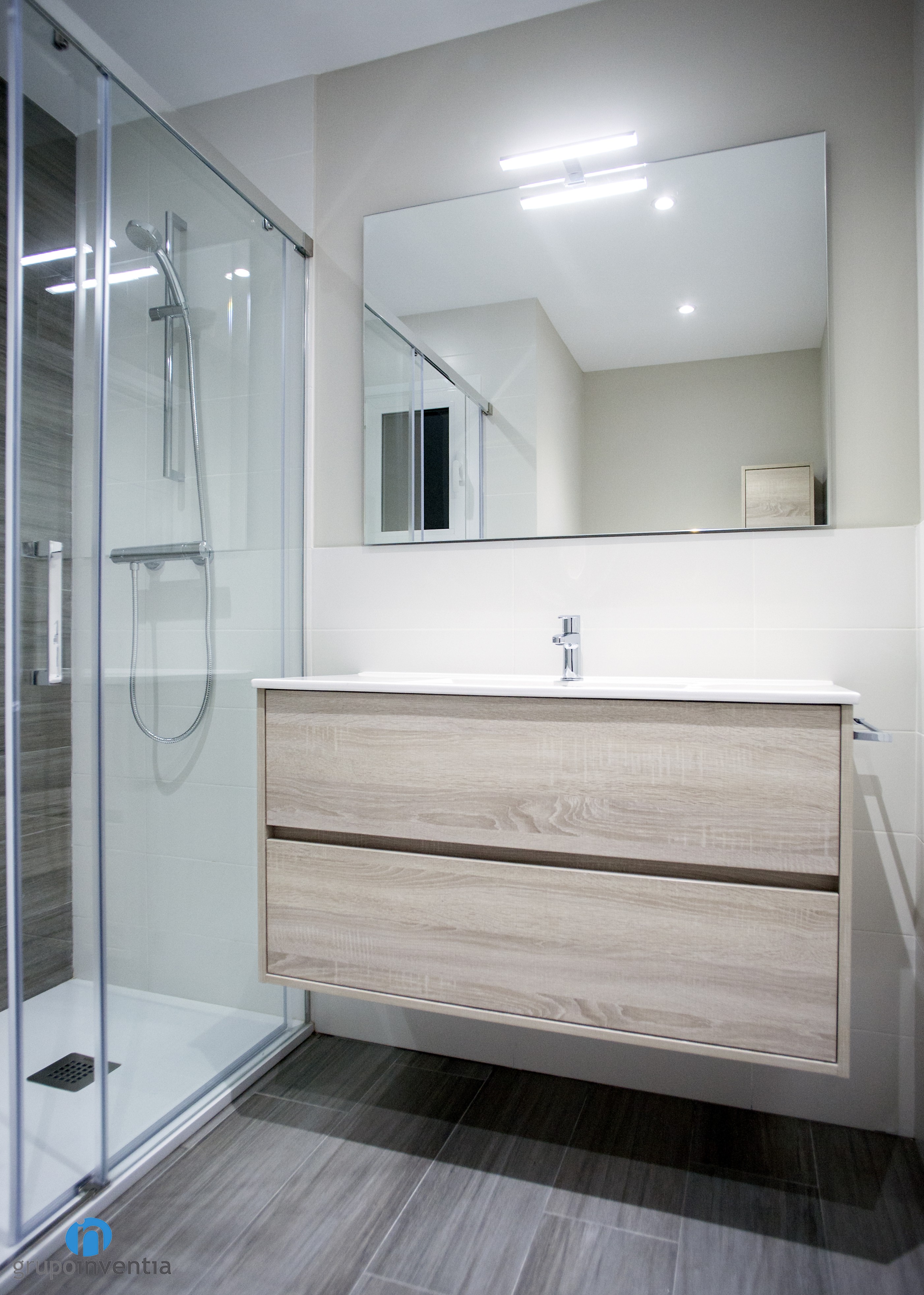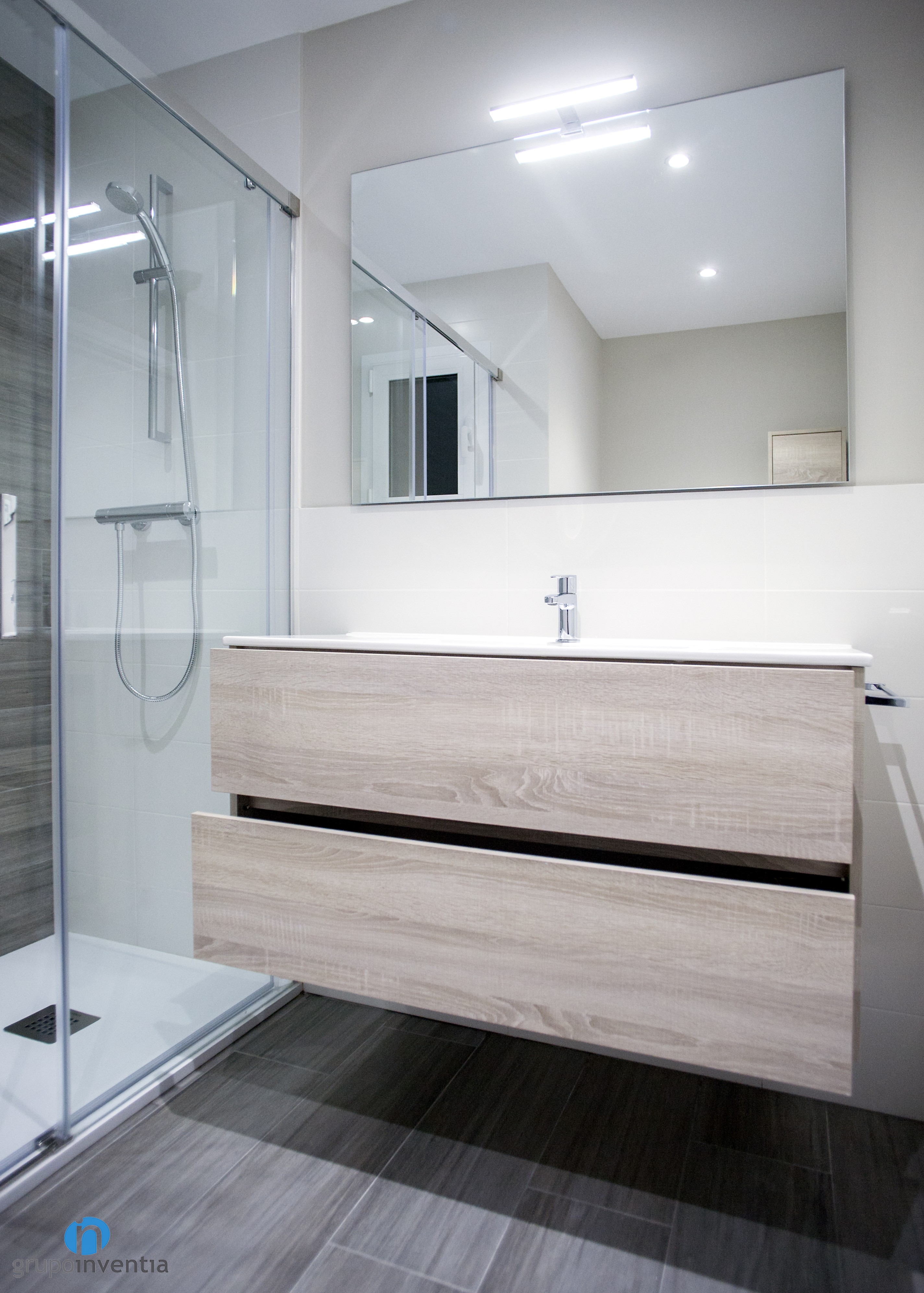 El cuarto de baño vio mejorada con creces su imagen con las paredes alicatadas a media altura con azulejos de color blanco y el resto pintado de beige, consiguiendo una estancia muy acogedora. El equipamiento sanitario también se renovó y ahora cuenta con un lavabo con cajonera incorporada, un inodoro y una ducha que ofrecen las mejores prestaciones.