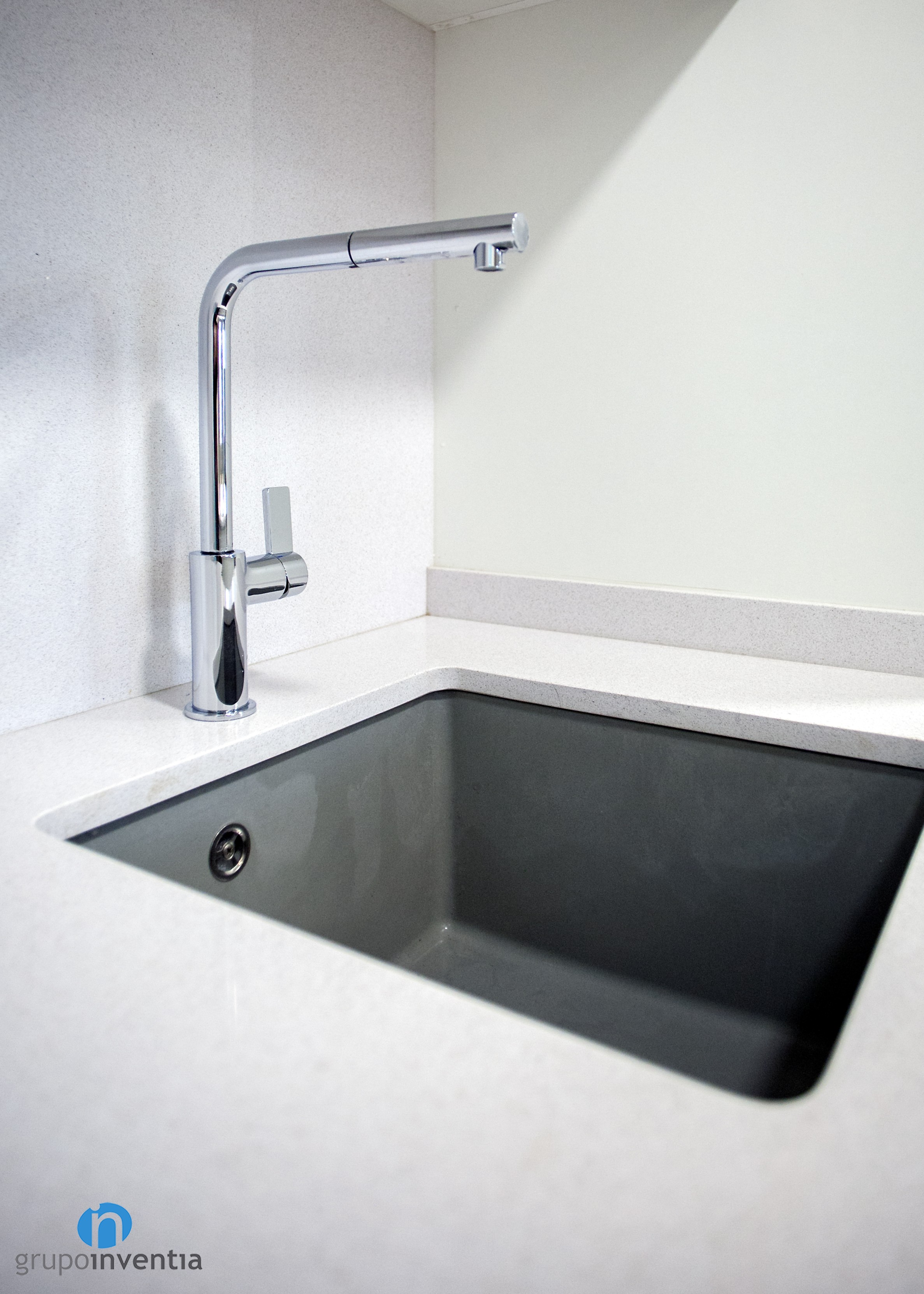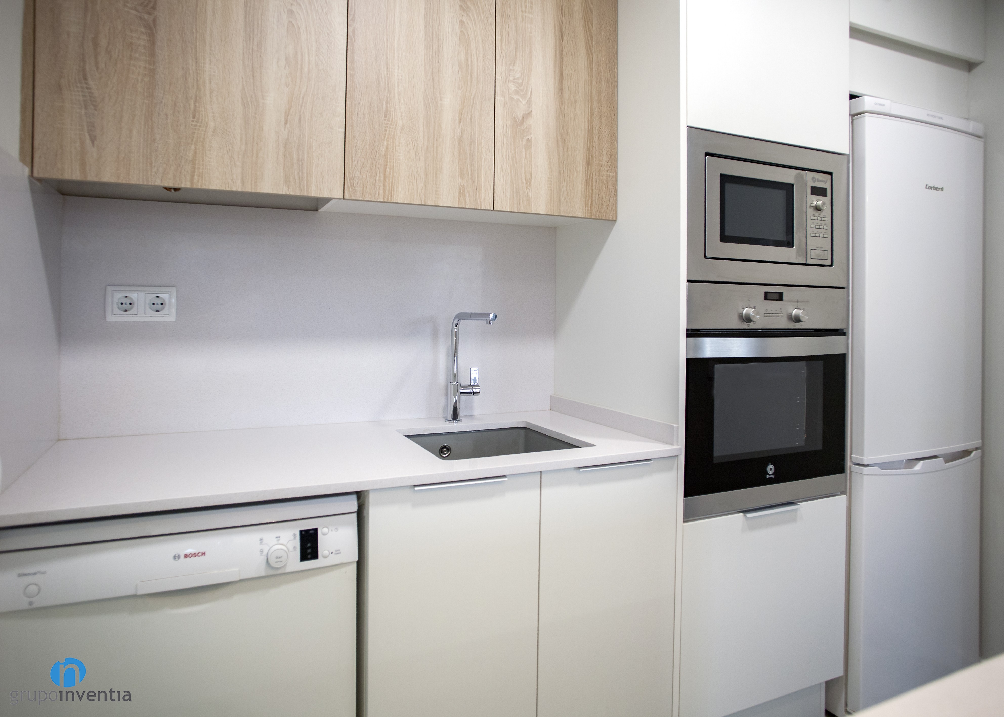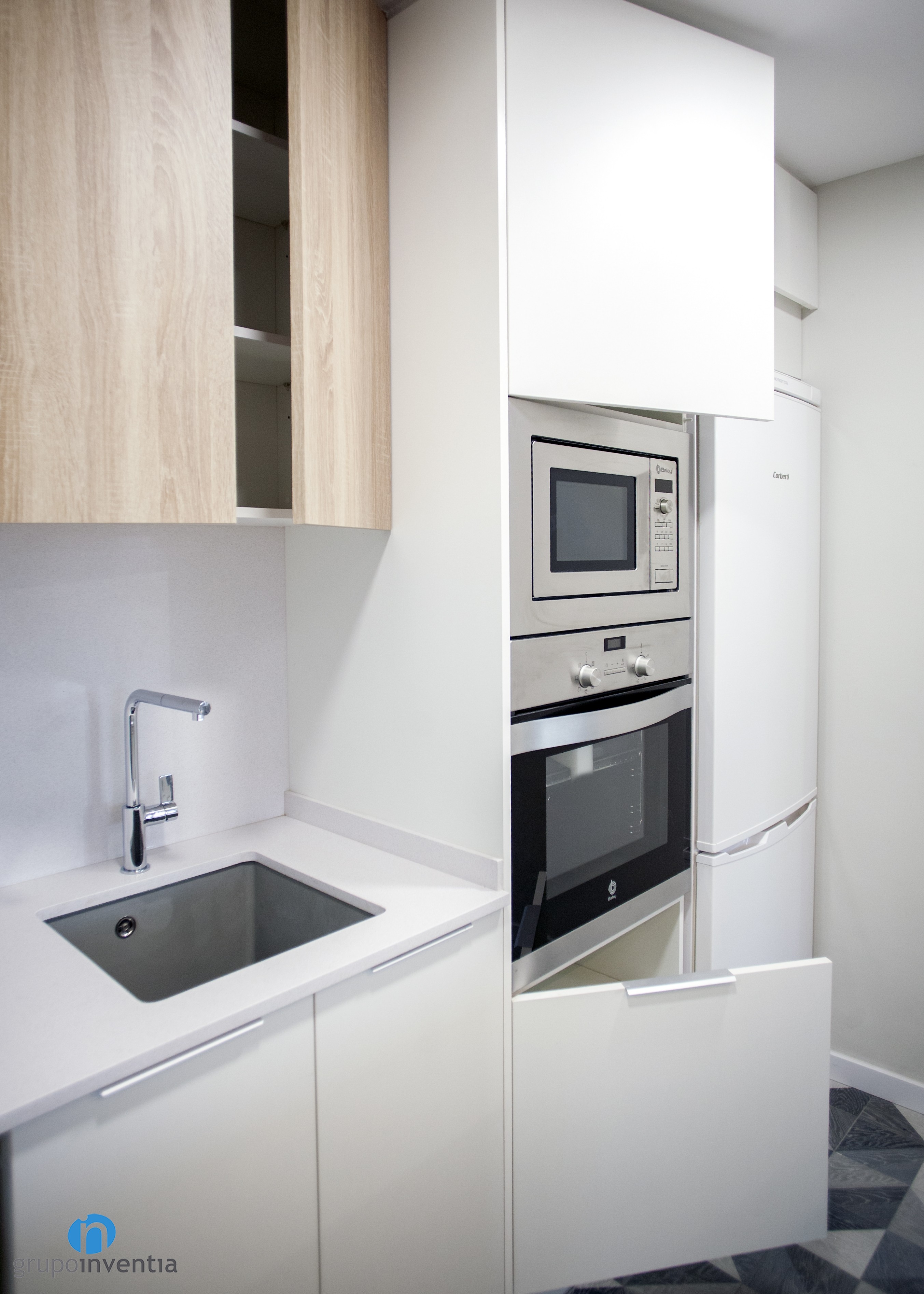 En el extremo derecho se encastraron los electrodomésticos, compuestos por una nevera, un horno y un microondas. Seguidamente nace una encimera que dispone de un fregadero individual y amplía el almacenaje con cajones y armarios tanto en su parte inferior como superior.