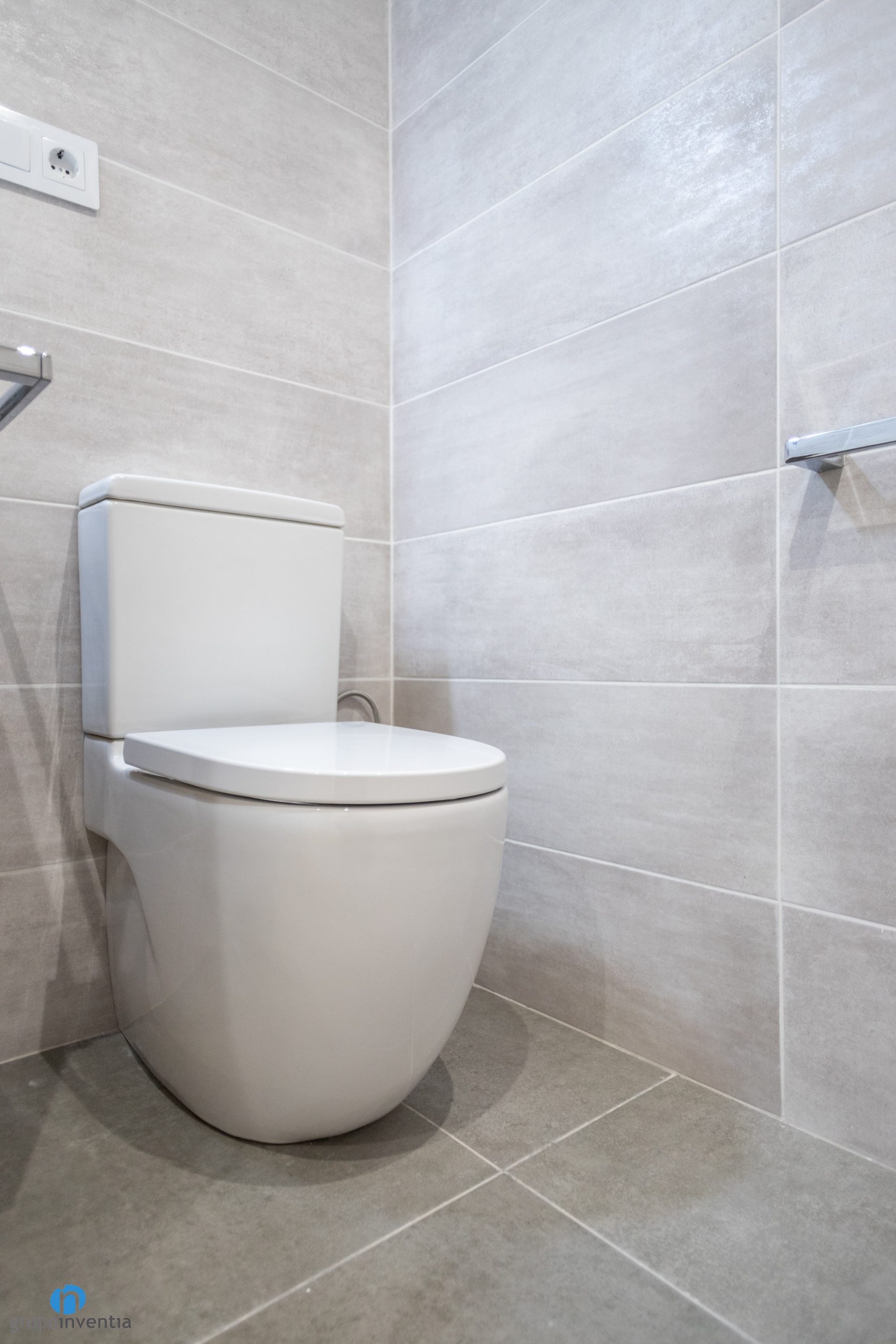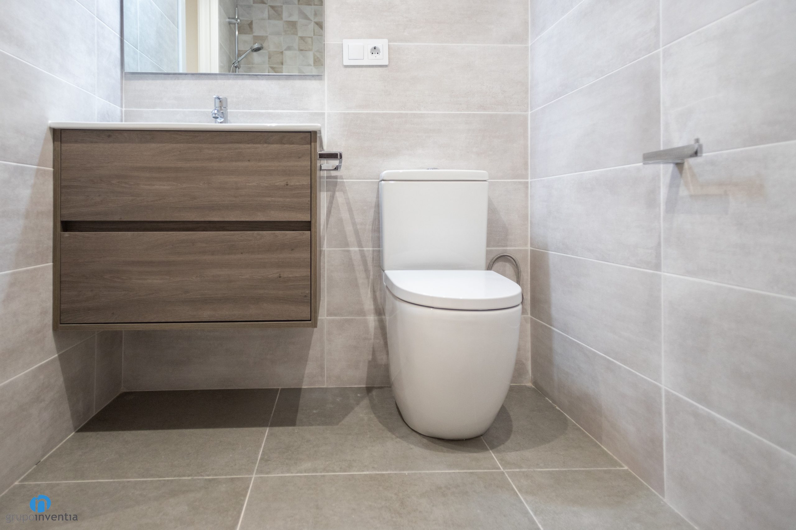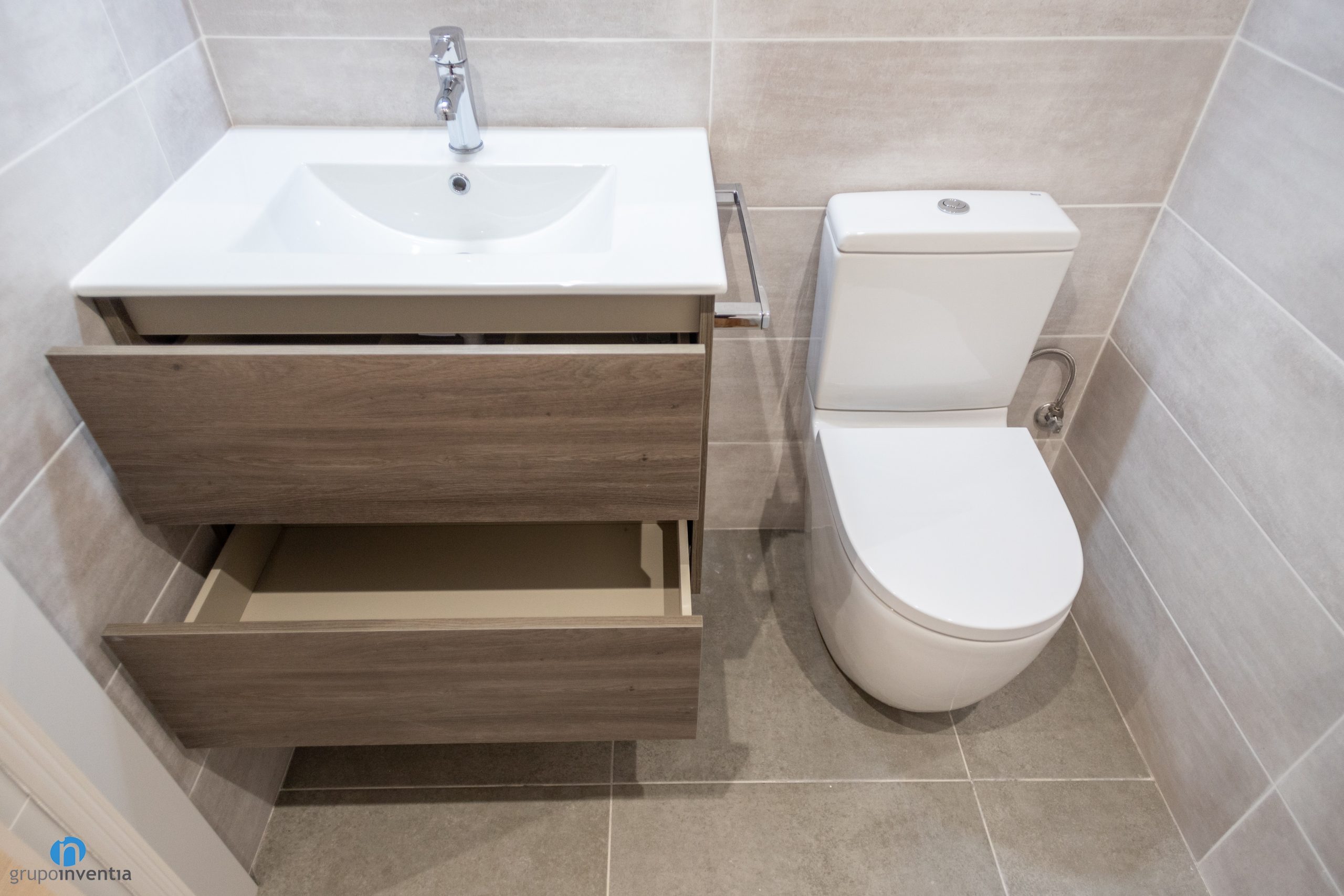 Otro de los espacios mejorados en esta reforma integral en Barcelona es el cuarto de baño. Tras el trabajo instalación realizado cuenta con un nuevo equipamiento sanitario. Se compone de un lavabo con un mueble de dos cajones, un inodoro y un plato de ducha de color blanco. En líneas generales un cuarto de baño funcional listo para ofrecer las mejores prestaciones.