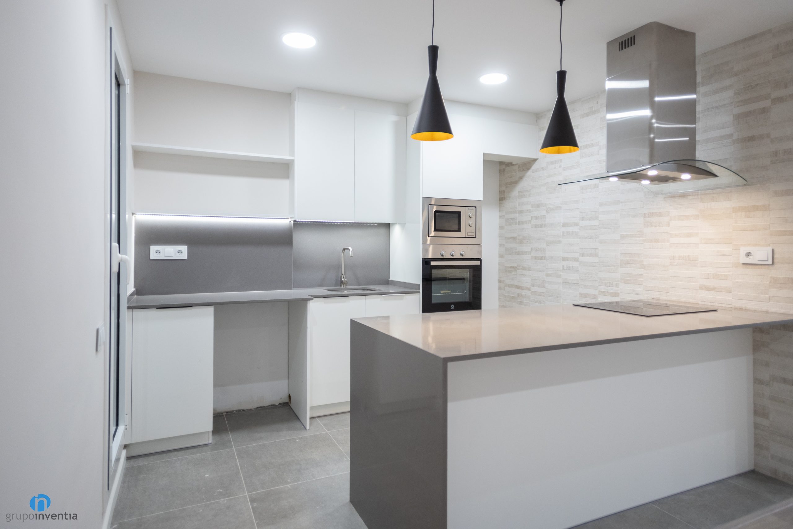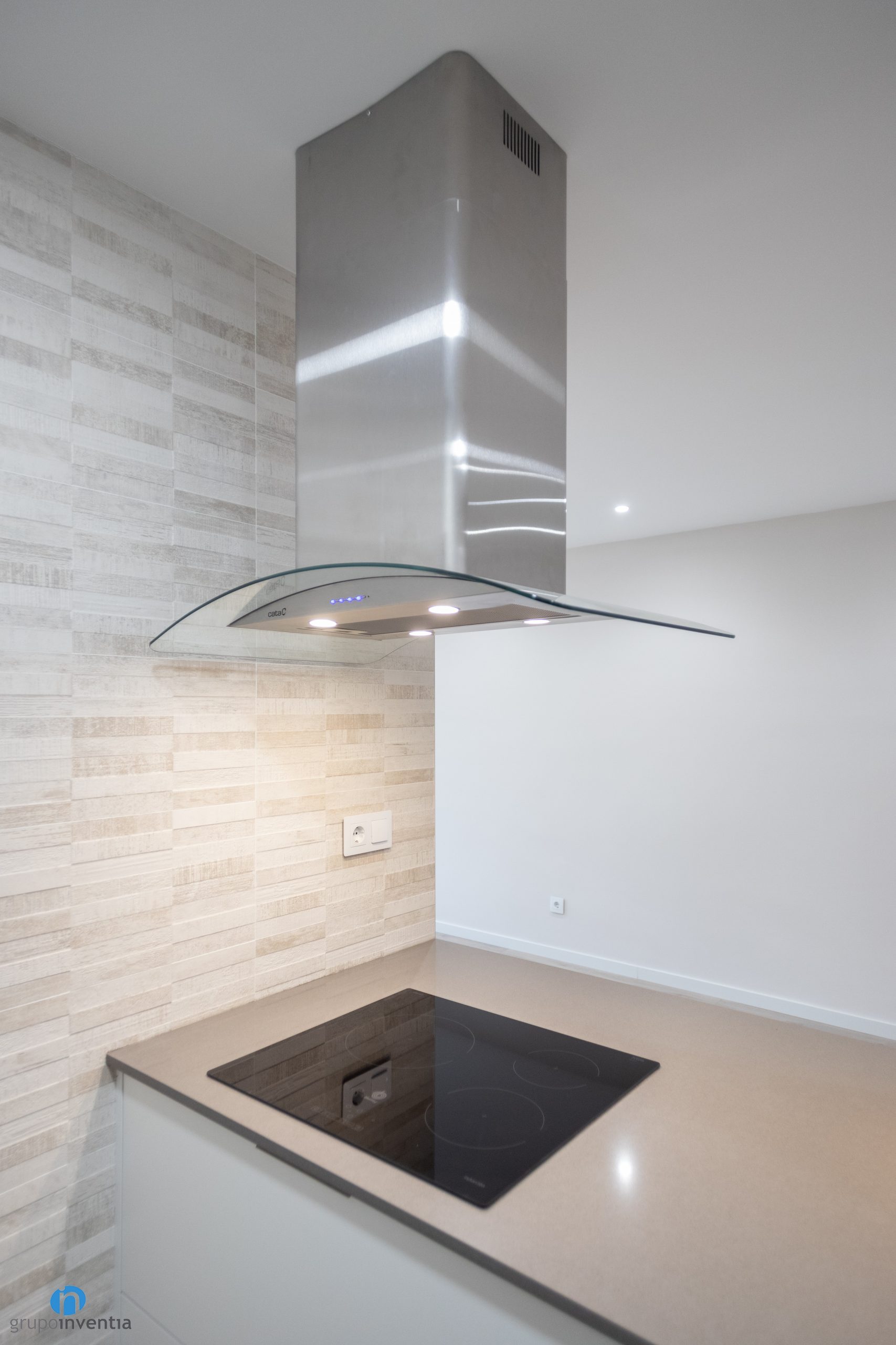 En esta ocasión hemos trabajado en la reforma integral de una cocina abierta. Para la disposición de los nuevos elementos se ha apostado por una distribución a dos frentes. En el lado derecho, el abierto, se ha colocado una amplia encimera equipada con una placa vitrocerámica. A esta le acompaña una campana extractora que desciende desde el techo. En la parte inferior cuenta con varios armarios que aportan capacidad de almacenaje.
