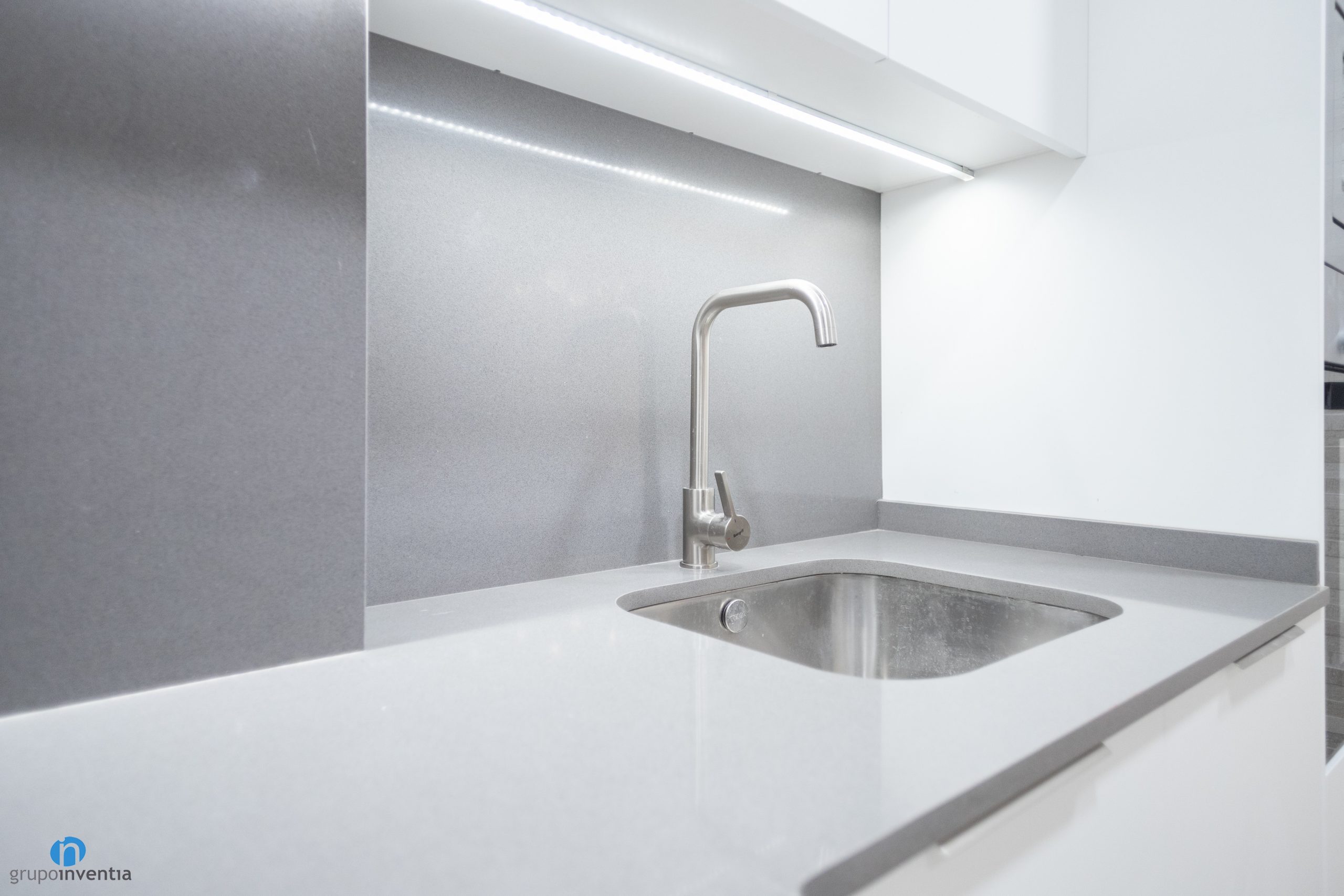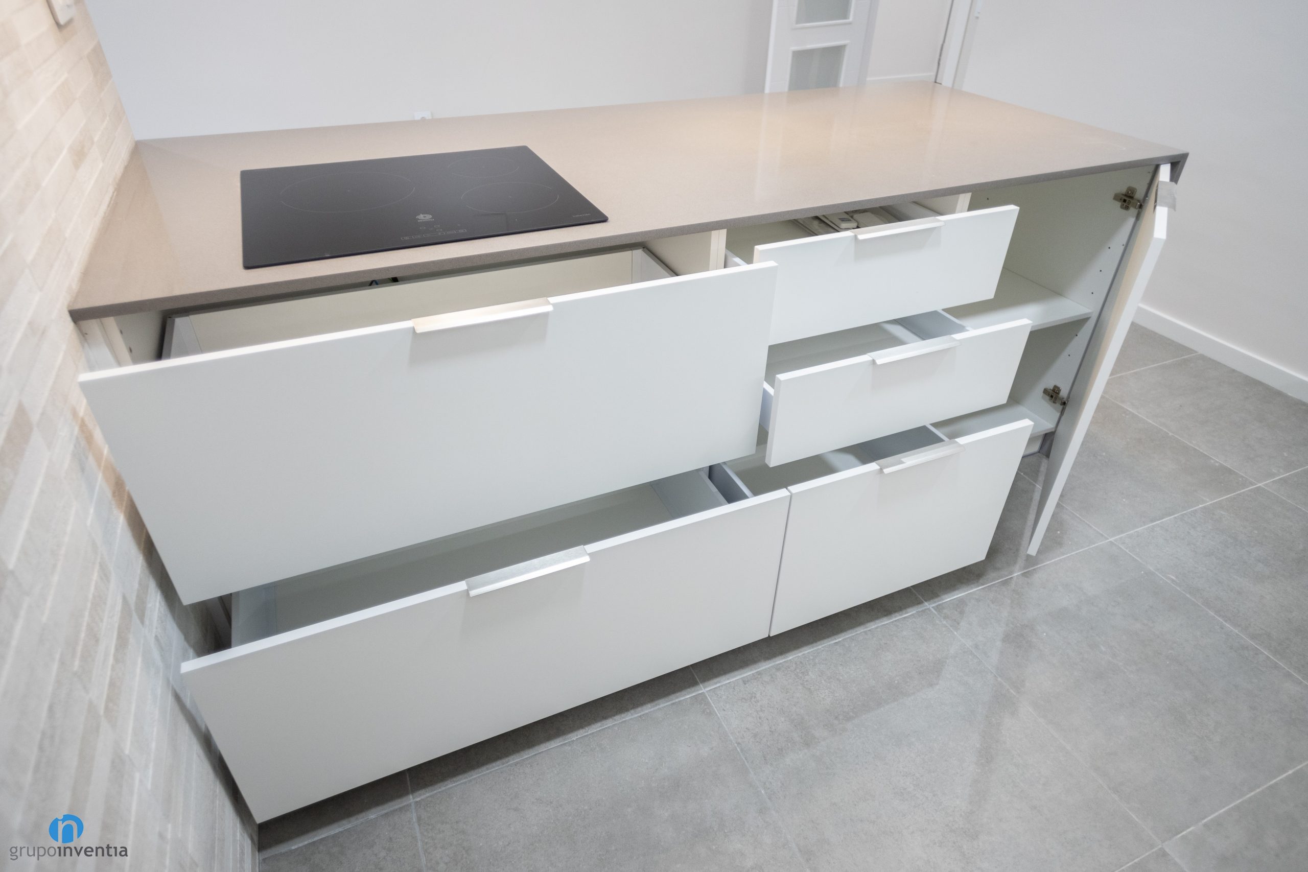 Si nos movemos al lado izquierdo vemos una nueva encimera, esta vez equipada con un fregadero. A su vez aporta una amplia superficie de apoyo y de trabajo. En el extremo se han dispuesto huecos a medida para integrar los nuevos electrodomésticos. Concretamente horno, microondas y nevera. Tanto en la parte inferior como superior de la encimera cuenta con capacidad de almacenaje en la cocina.