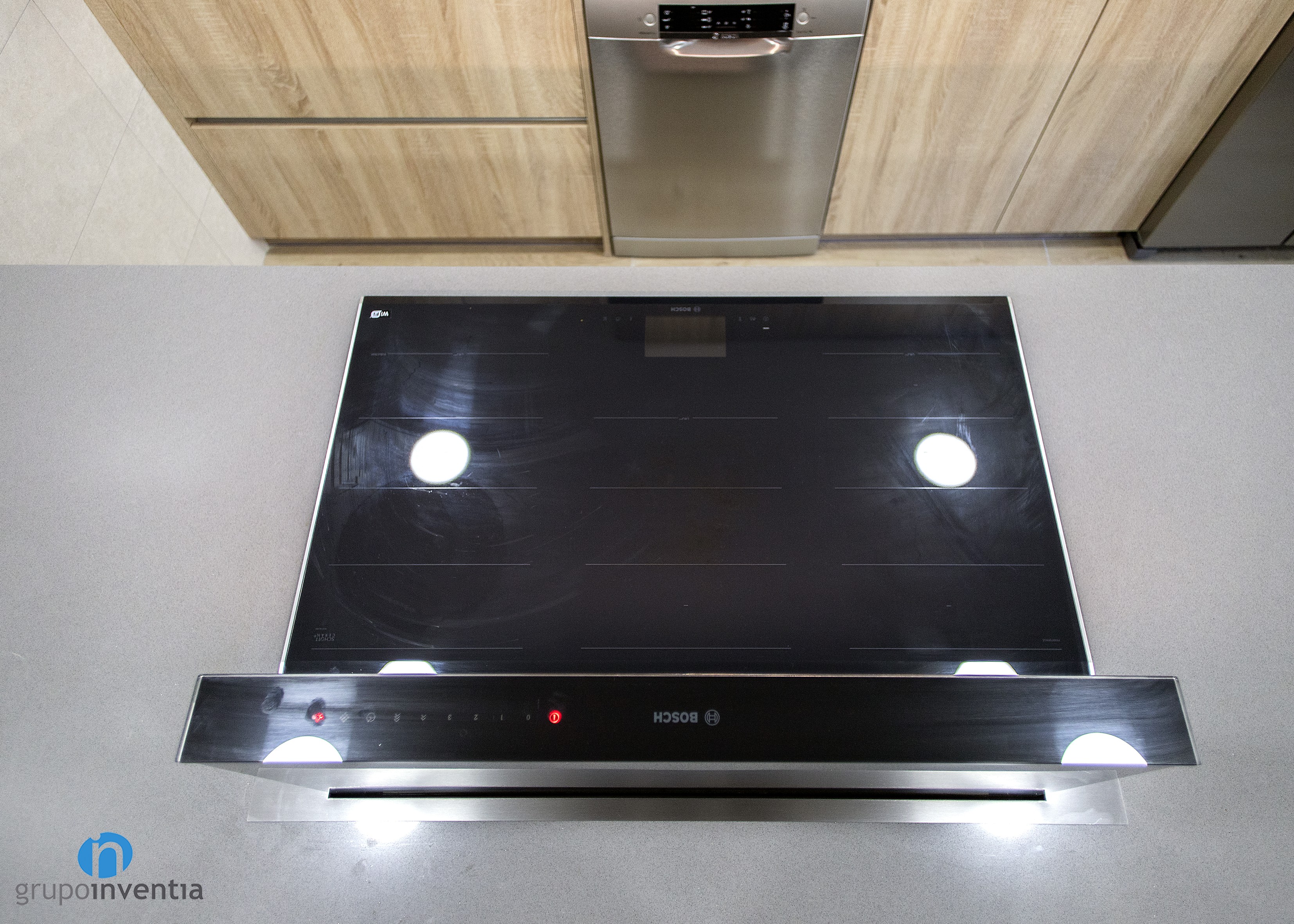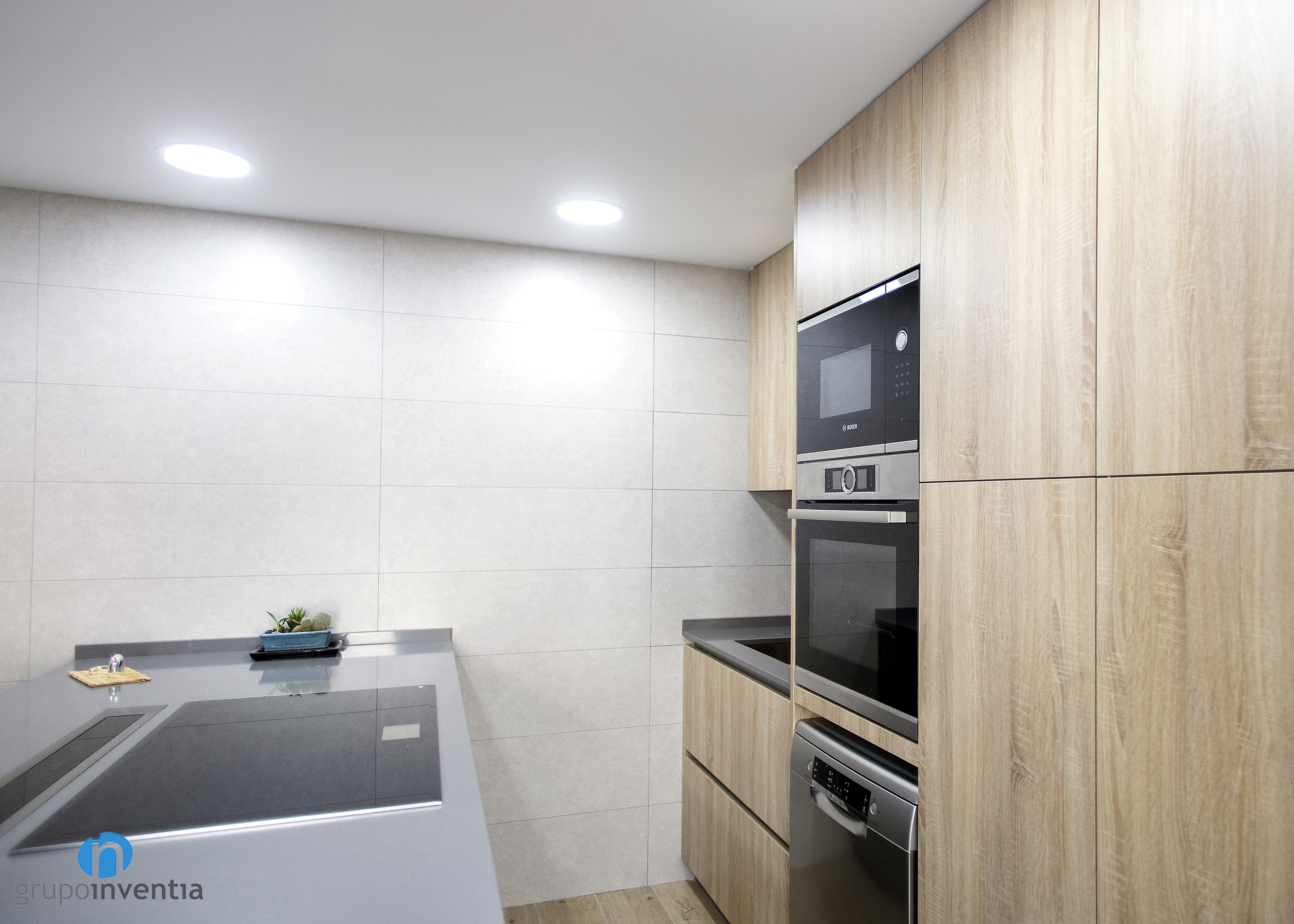 Para la nueva imagen de la reforma de cocina se apostó por tonalidades neutras que generaran un espacio amplio y luminoso, con una atmósfera perfecta para el día a día. Para ello, el mueble de cocina se presenta con acabados en madera y se combina con las encimeras grises. Para el pavimento se escogieron baldosas que imitan el acabado en madera.