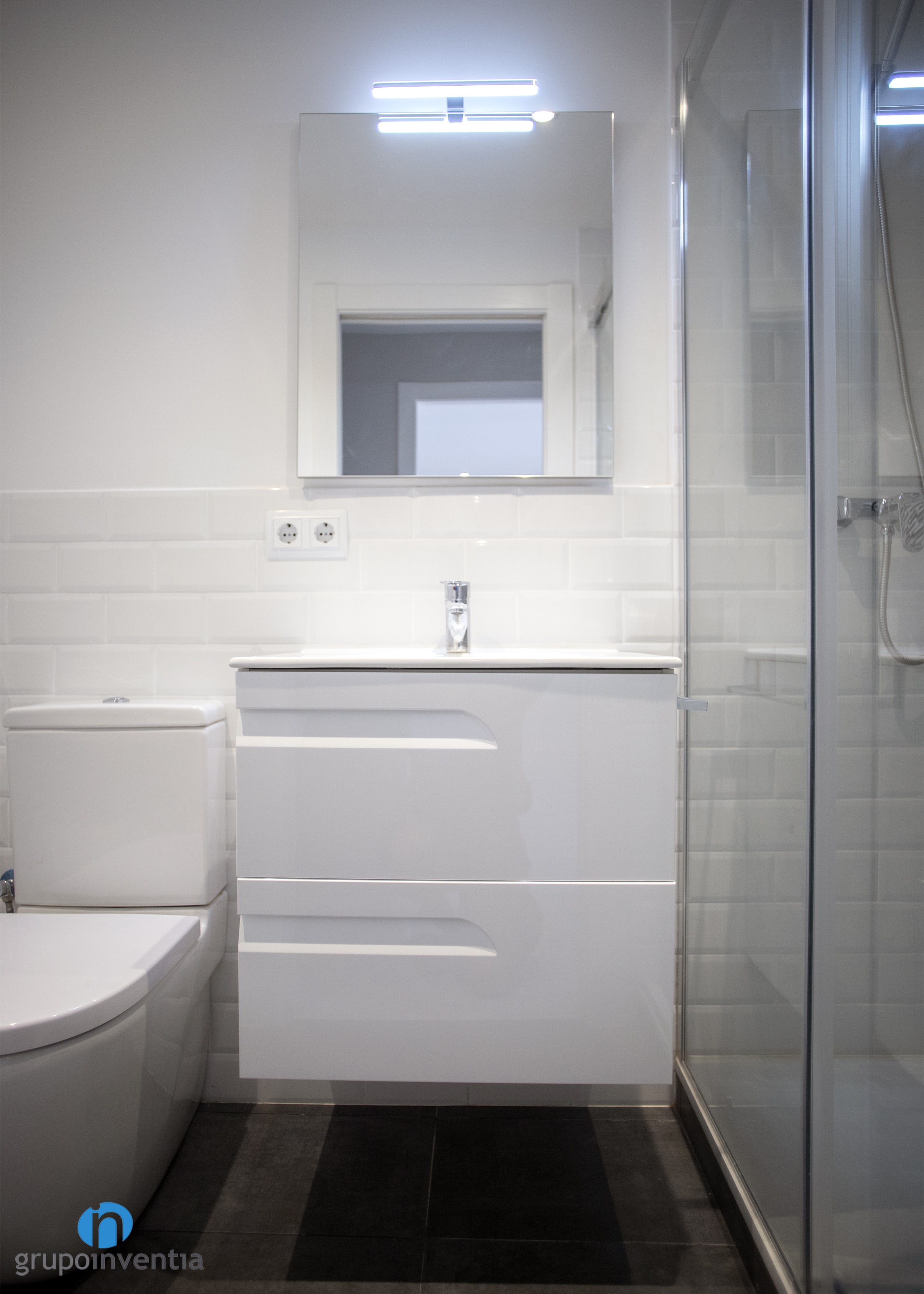 El cuarto de baño también se mejoró con creces. En cuanto al nuevo diseño, las paredes se alicataron a media altura con azulejos tipo metro de color blanco, mismo color con el que se pintó el resto hacia el techo. Esto se combinó con un pavimento de gres en tono oscuro, algo que contribuye a generar sensación de amplitud y luminosidad.