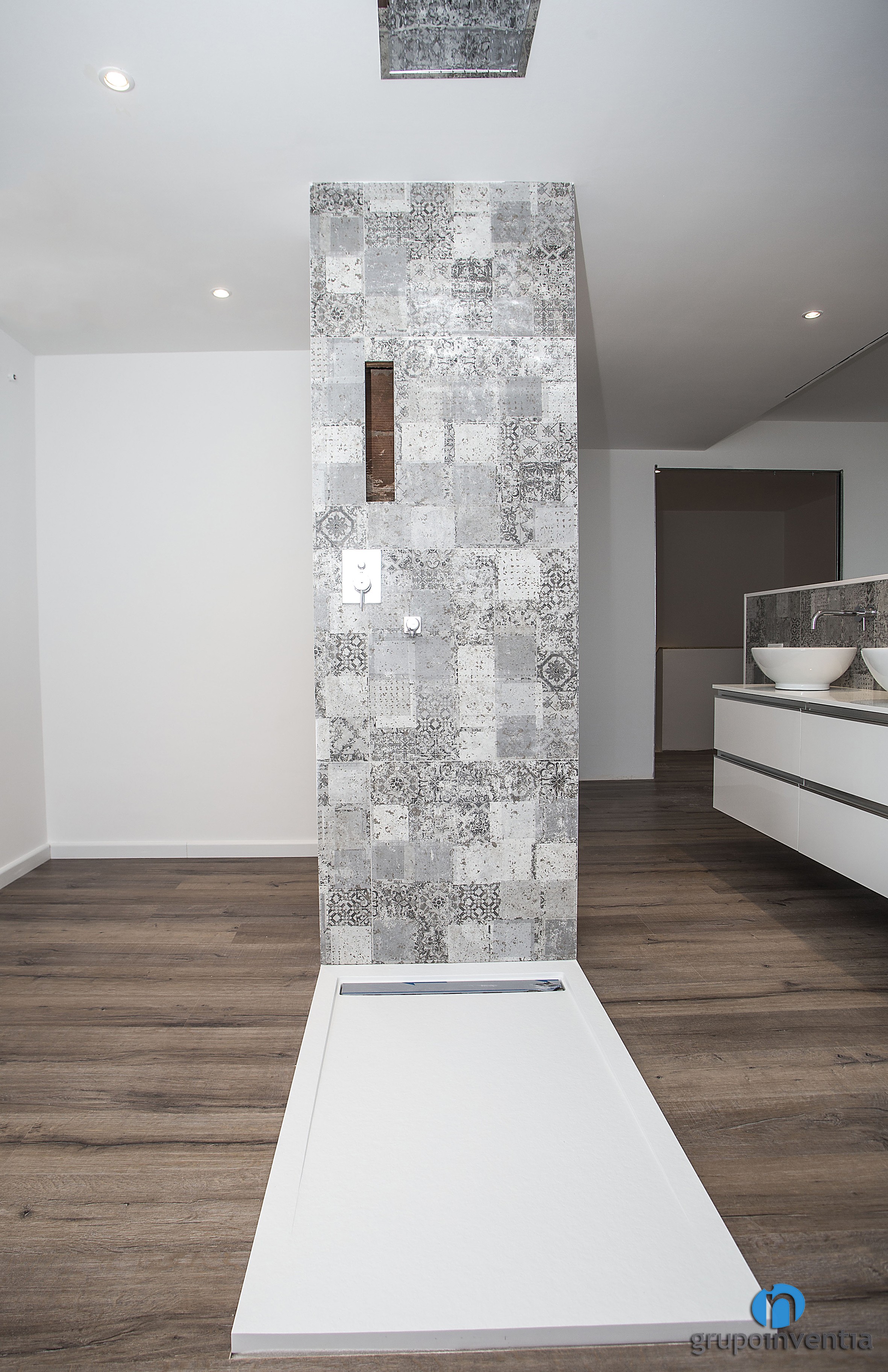 En su diseño interior se utilizó el color blanco y para los alicatados se optó por azulejos grises en diferentes tonos. Algo muy sutil, pero que delimita correctamente los espacios dedicados al cuarto de baño.