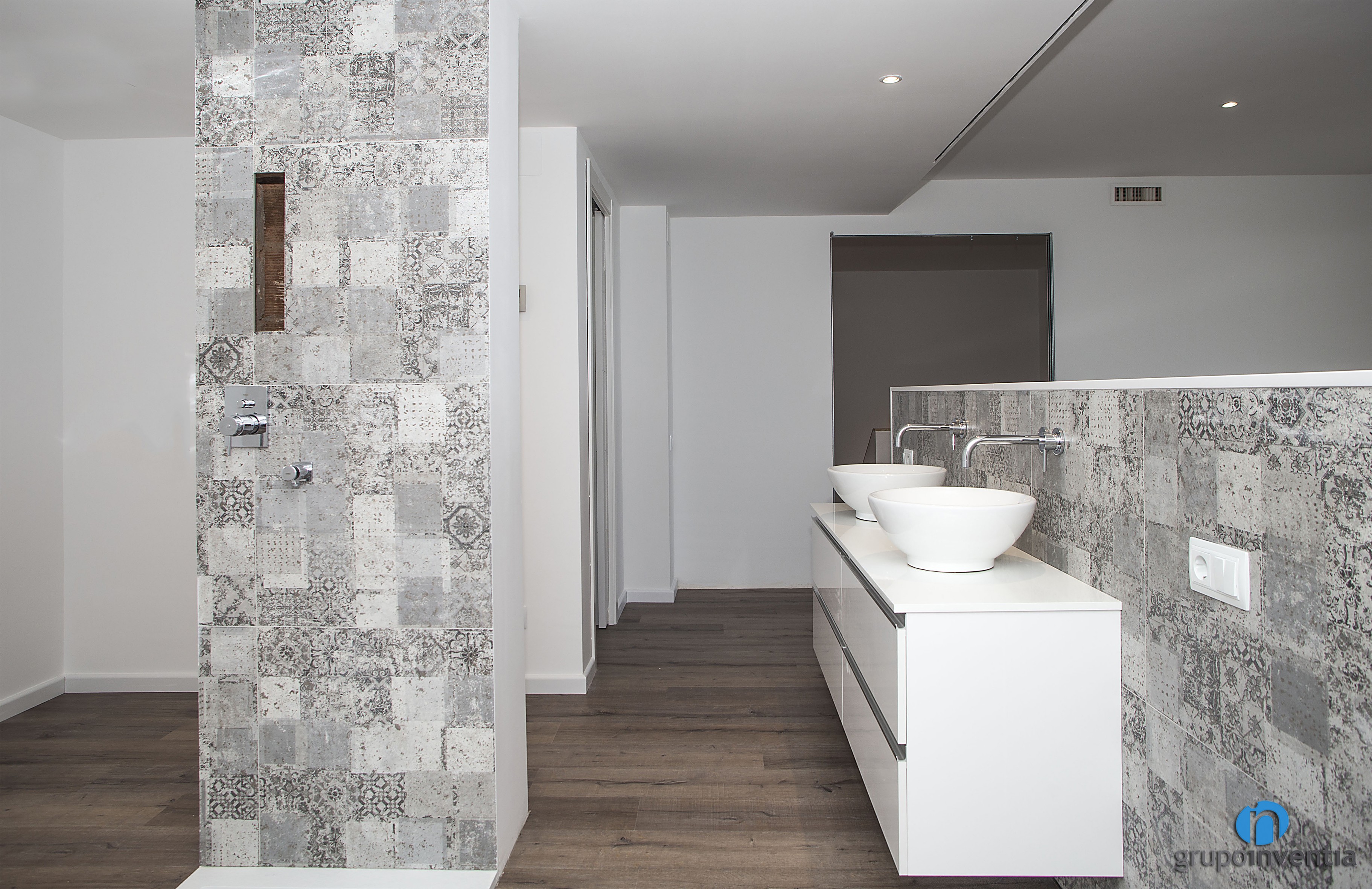 Una de las estancias más llamativas de esta reforma integral es el dormitorio suite, que cuenta con un baño abierto. Se trata de una estancia amplia en la que la zona de dormitorio está delimitada por un cabecero de cama. Detrás de este se ubica un lavabo doble con cajonera incorporada y delante de éste una ducha a ras de suelo completamente abierta. En una estancia separada se encuentra la pareja de inodoro y bidet, ambos suspendidos.