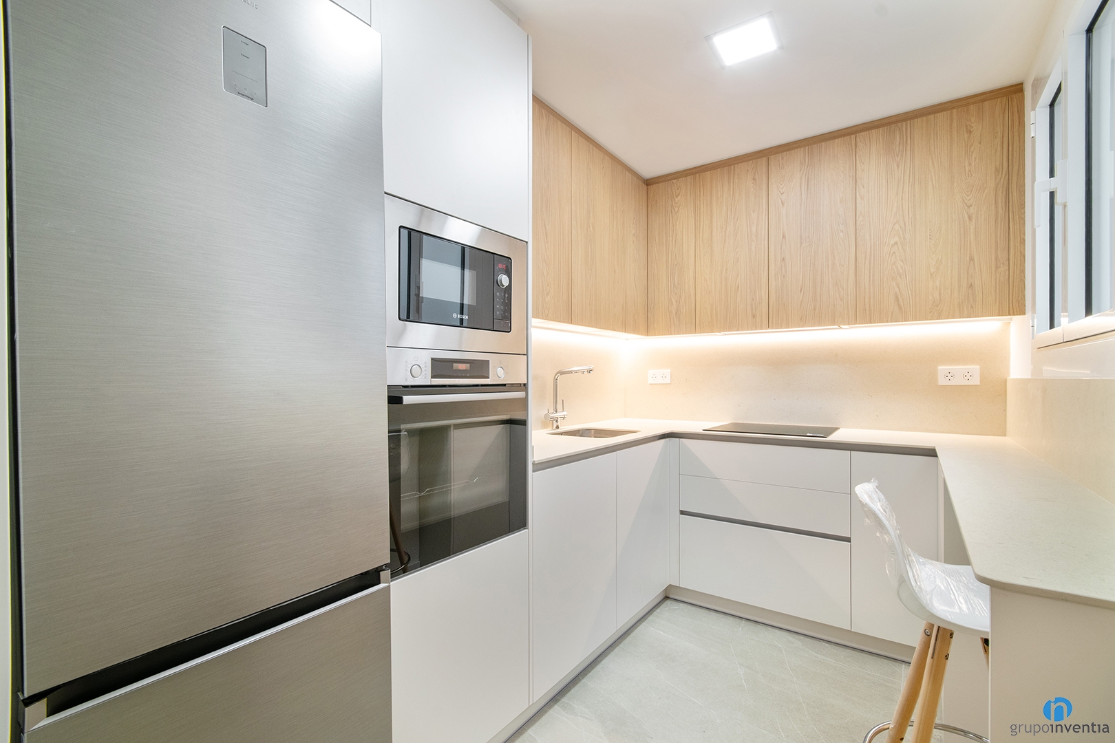 La nueva cocina está distribuida en forma de U y ofrece una movilidad excelente en su uso. Tras la reforma de cocina cada elemento ocupa el lugar más funcional dentro de la estancia. En el extremo izquierdo encontramos los nuevos electrodomésticos integrados. Una nevera, un horno y un microondas.