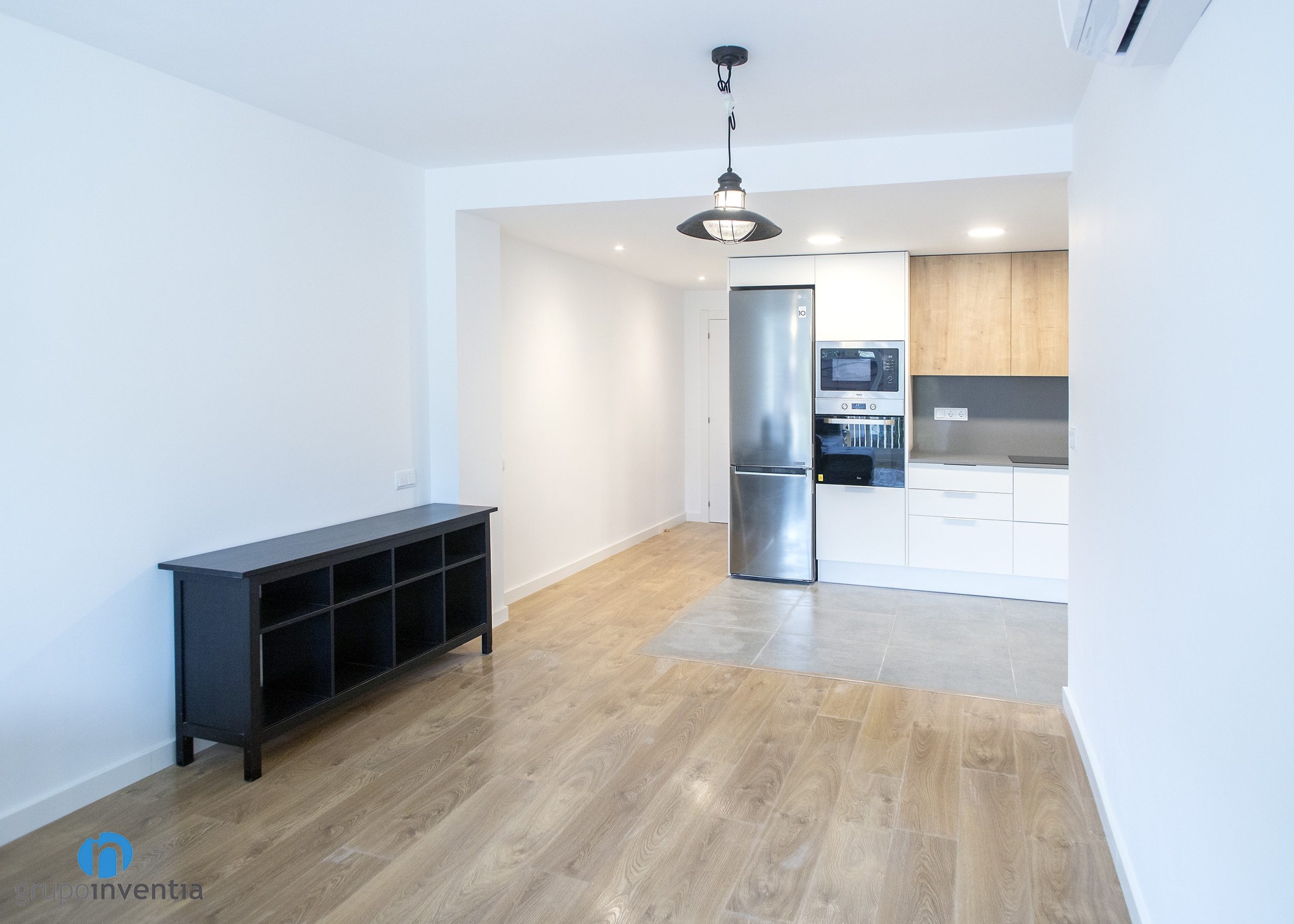 Se trata de una cocina abierta y distribuida en forma lineal, consiguiendo una perfecta movilidad para hacer uso de todos sus rincones. En el extremo del lado izquierdo se han encastrado la nevera, el horno y el microondas. Seguidamente nace un primer tramo de encimera equipado con una placa vitrocerámica. Esta zona cuenta con capacidad de almacenaje tanto en la parte inferior como superior.
