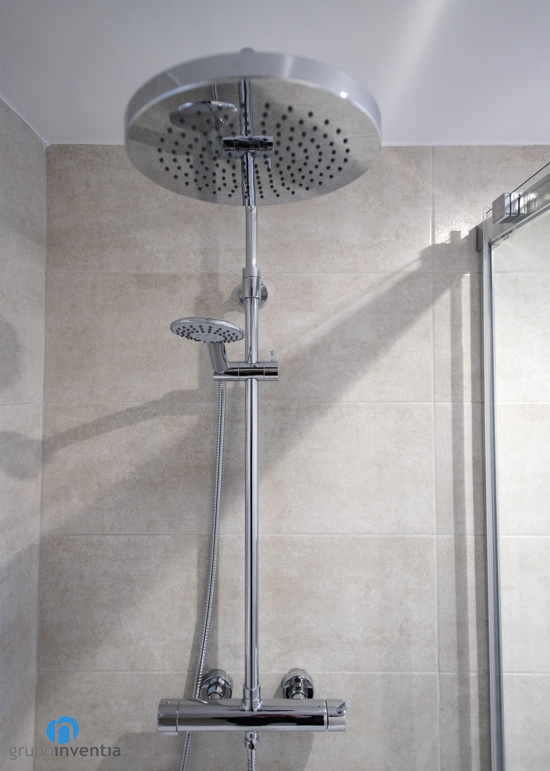La vivienda cuenta con dos cuartos de baño que han sido totalmente renovados. En ambos se han utilizado los mismos acabados para crear la nueva imagen, consiguiendo dos espacios amplios y luminosos. En esta reforma de baños las paredes se han alicatado con azulejos beige, una tonalidad neutra que ha permitido introducir otros acabados como el de la madera del mueble de baño.