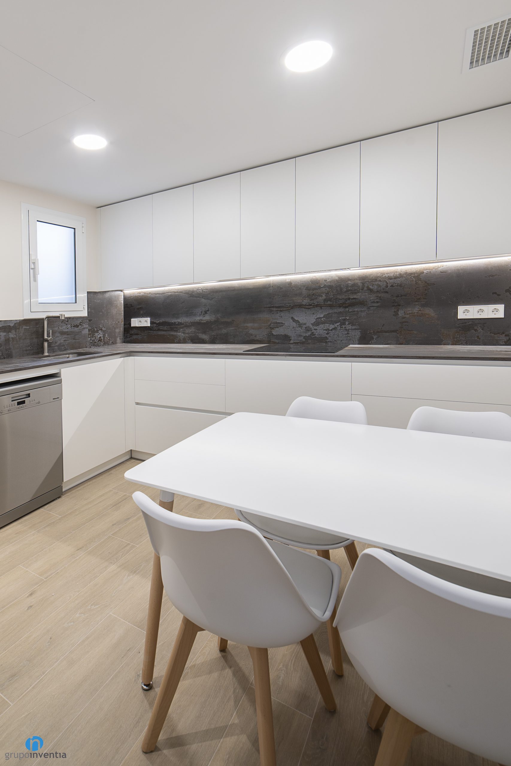 Al ser un espacio tan amplio se ha habitado una zona office con una mesa y varias sillas. De este modo se ha conseguido un espacio de comedor distendido. El lado izquierdo lo ocupa la otra parte del mueble de cocina con una encimera en forma de L que aporta una gran superficie de apoyo. Otra de las novedades en esta reforma de cocina es que tanto en la parte inferior como superior cuenta con capacidad de almacenaje.