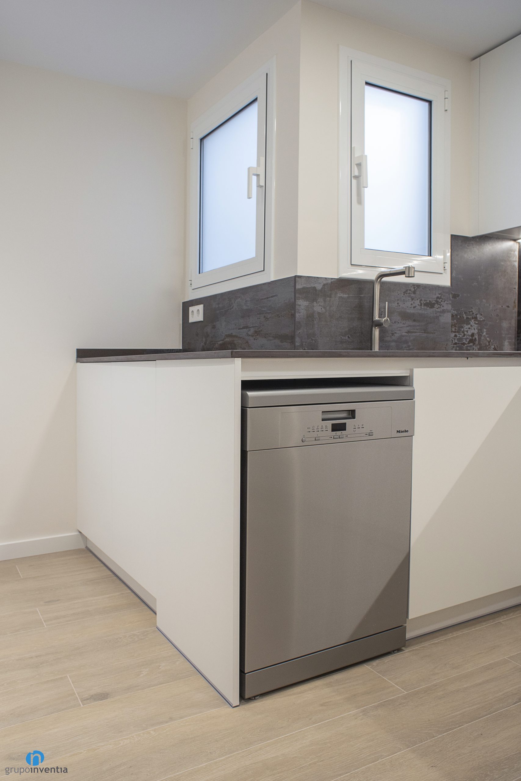 Las encimeras contrastan con el mueble blanco de cocina y se presentan en color negro. Sobre ellas se ha instalado el fregadero y la placa vitrocerámica. En la zona inferior también se ha integrado un lavavajillas que completa el nuevo equipamiento de cocina. También se ha colocado un nuevo pavimento, un suelo cerámico imitación parquet.