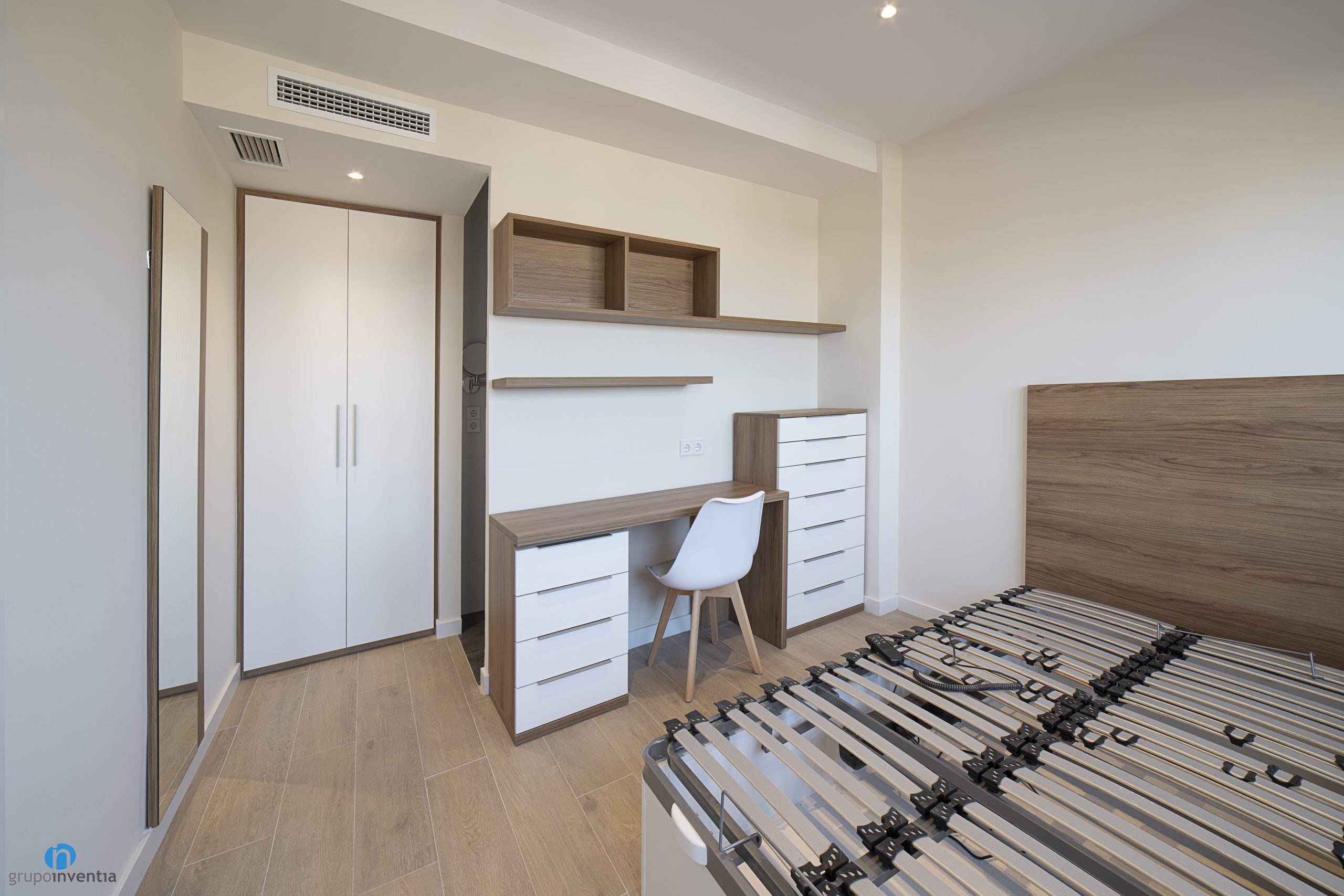 Otra novedad en esta reforma integral es el mobiliario que se ha colocado en varios espacios. Entre ellos la sala de estar con un sofá y un mueble para la televisión. También hay nuevo mobiliario en los dormitorios, con sus correspondientes camas y armarios para el almacenaje. Se debe destacar que esta vivienda dispone de un vestidor y que también se ha remodelado el recibidor. Todos los muebles tienen acabados en madera o de color blanco y se ajustan perfectamente a la imagen contemporánea que se pretende.