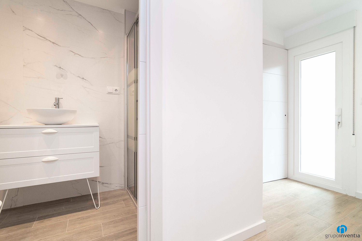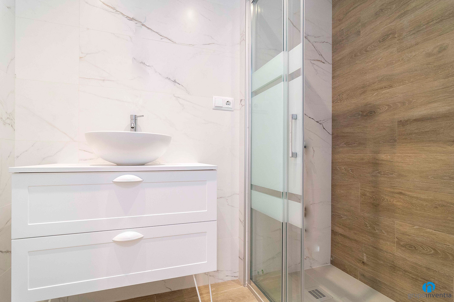 El cuarto de baño de esta planta baja también ha sido completamente reformado, apostando por una distribución práctica y funcional. Incluye un plato de ducha a ras de suelo con mampara de cristal, un mueble de lavabo con cajones de gran capacidad y un moderno lavamanos de sobre encimera. Todo ha sido pensado para ofrecer el máximo confort en el uso cotidiano.