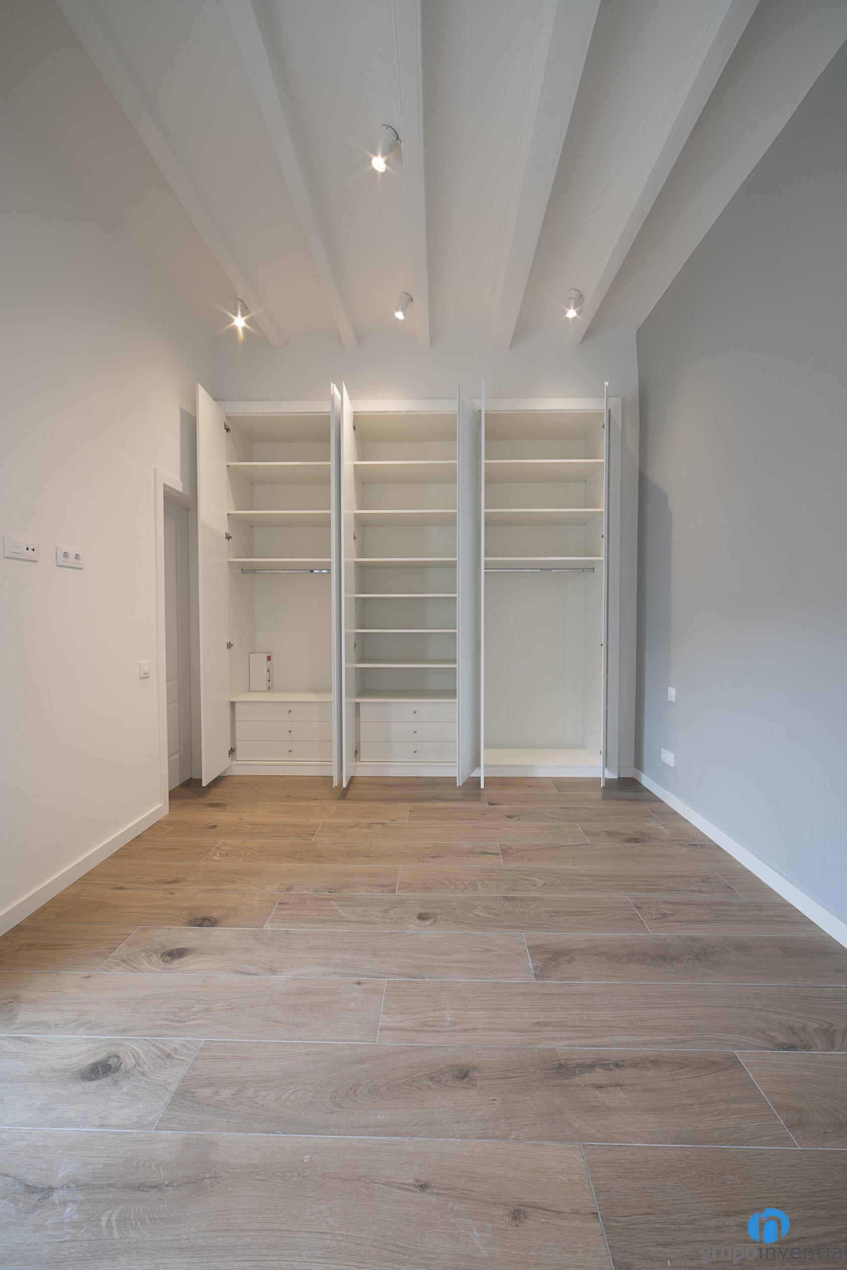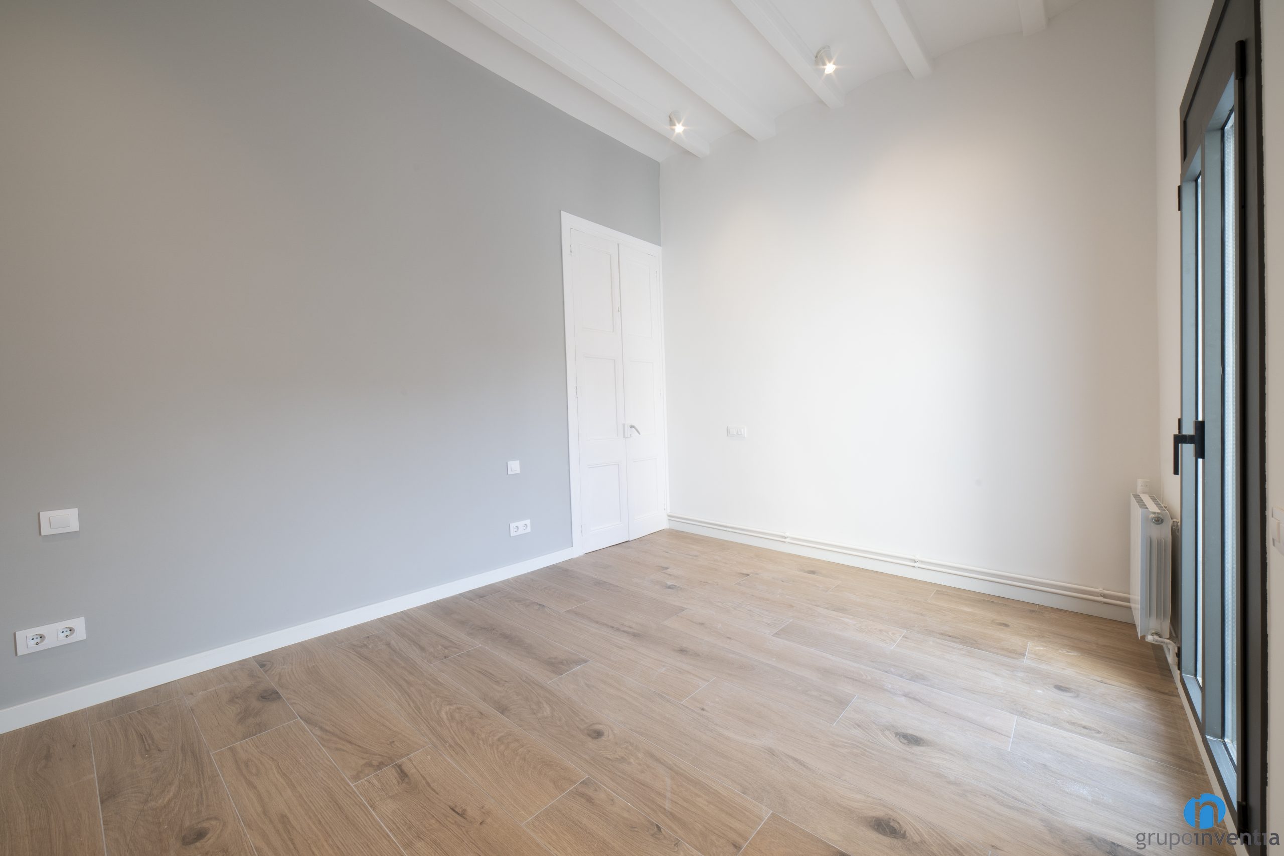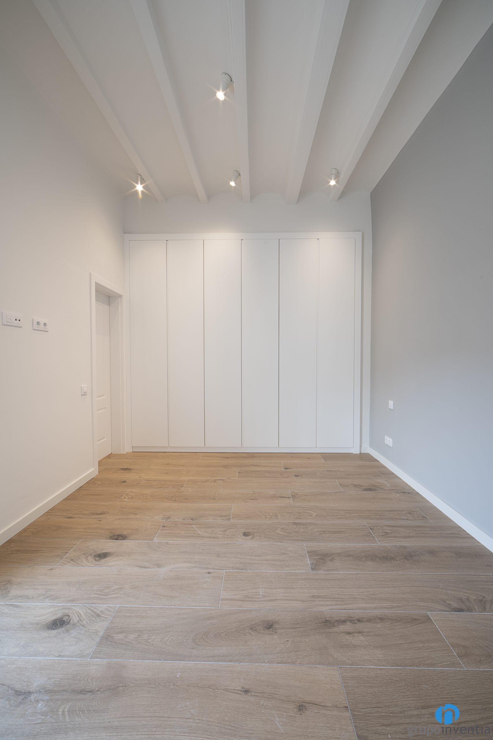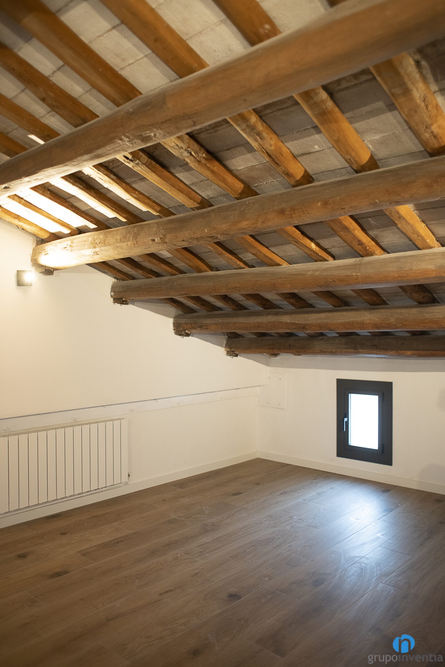 Además de aportar calidez también contribuyen a generar espacios luminosos y a potenciar la sensación de amplitud. Del mismo modo también hemos restaurado algunos elementos originales. Entre ellos destaca el techo de vigas de madera de la última planta. También hemos puesto un nuevo suelo cerámico imitación parquet en todas las plantas.