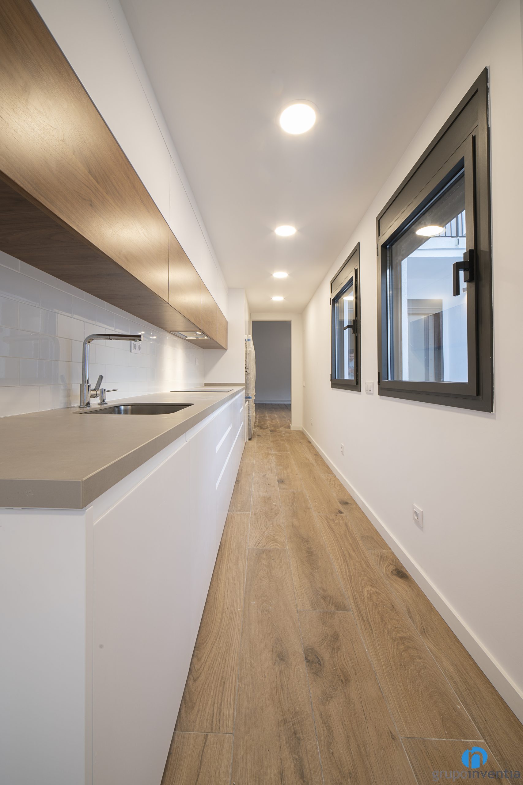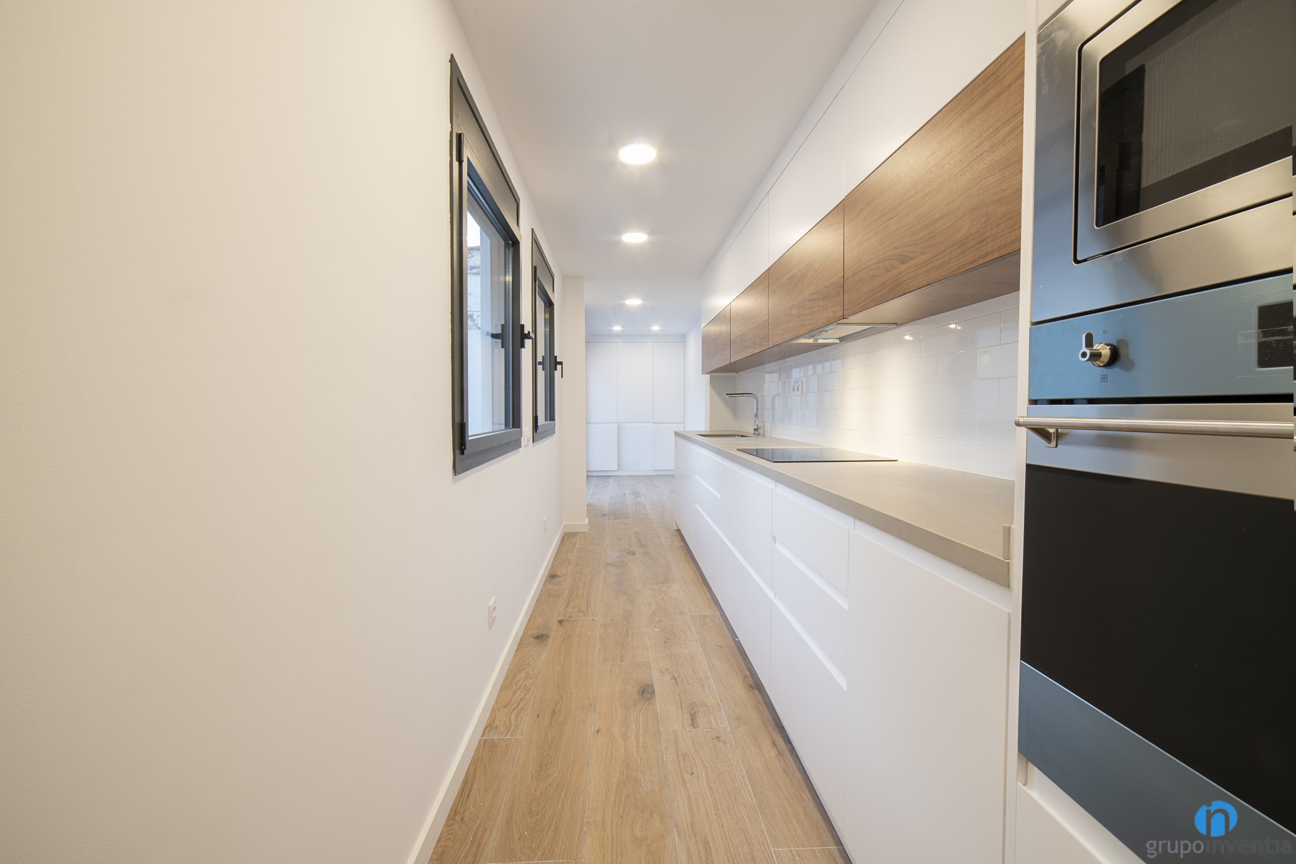 En el extremo de la derecha se han integrado los nuevos electrodomésticos. Concretamente hay espacio para una nevera, un horno y un microondas. Acto seguido nace una encimera que llega hasta el otro extremo de la cocina. Es muy amplia y ofrece una gran superficie de apoyo y de trabajo. Además, está equipada con una placa vitrocerámica y un fregadero de un seno.