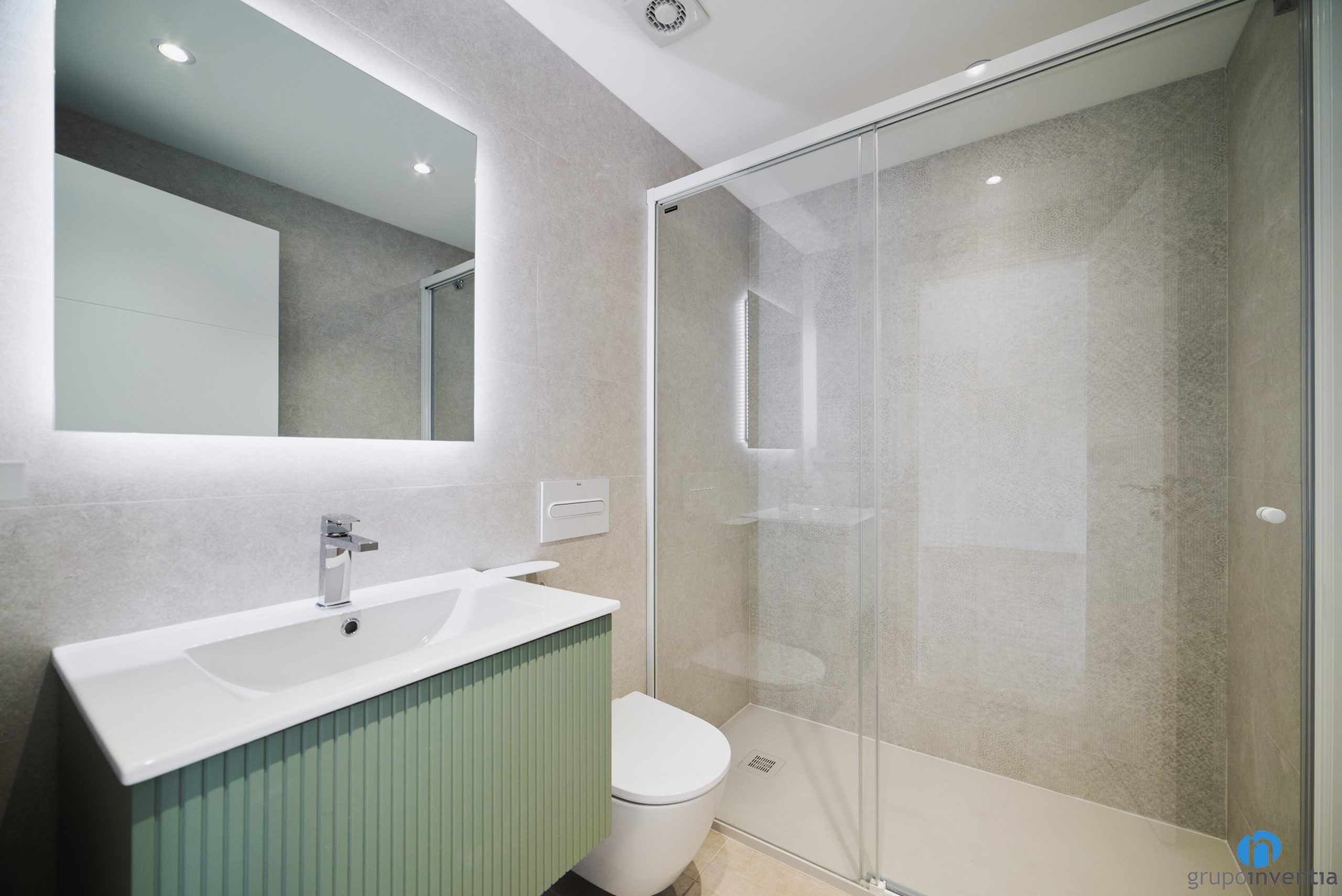 Cada reforma de baño cuenta con un lavabo con mueble de almacenaje incorporado. De este modo se pueden organizar con facilidad todos los productos de higiene. También dispone de un nuevo inodoro de líneas modernas y de un plato de ducha. La zona de aguas queda protegida por unas mamparas de puertas correderas. Por su parte el aseo cuenta con un lavabo y un inodoro.