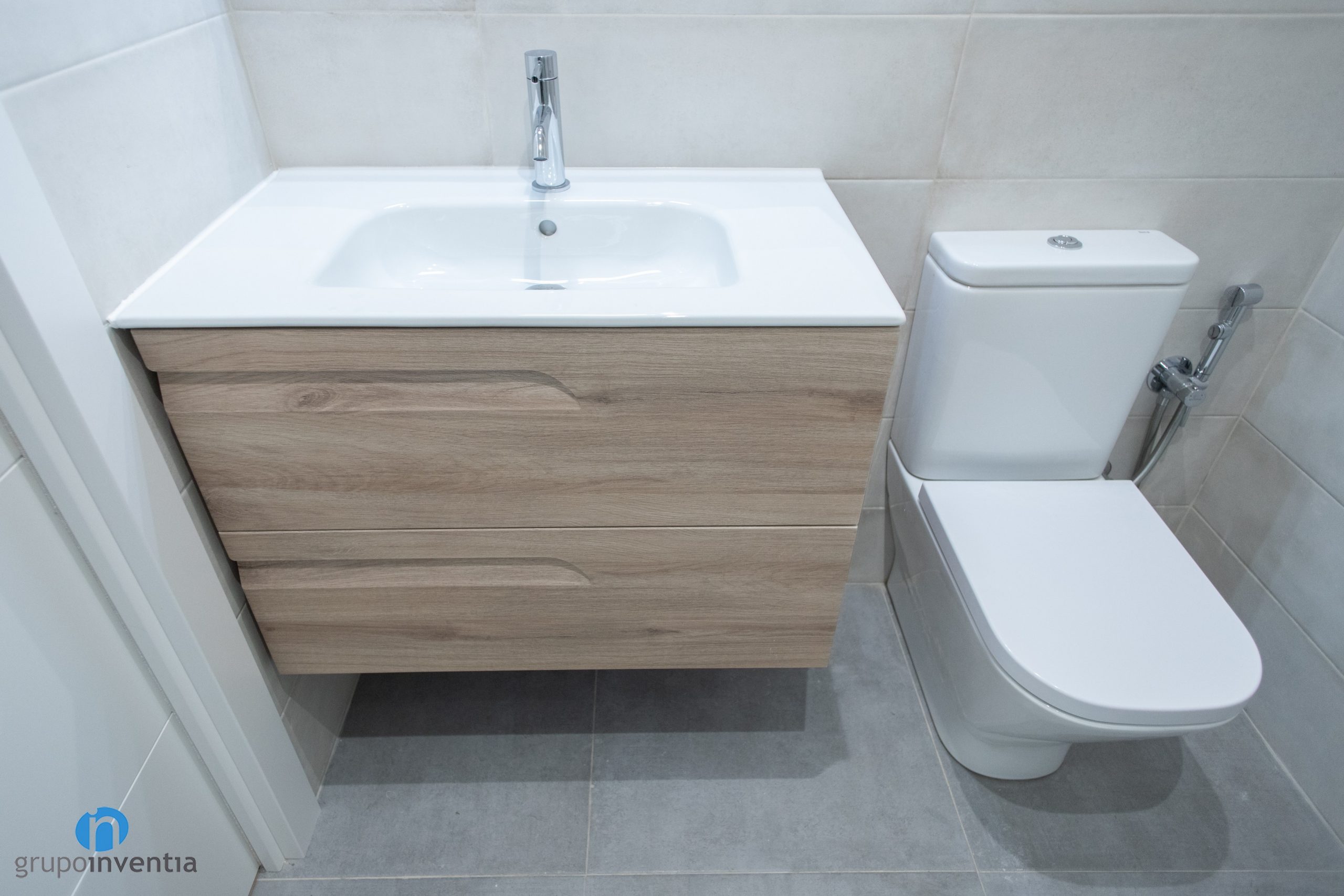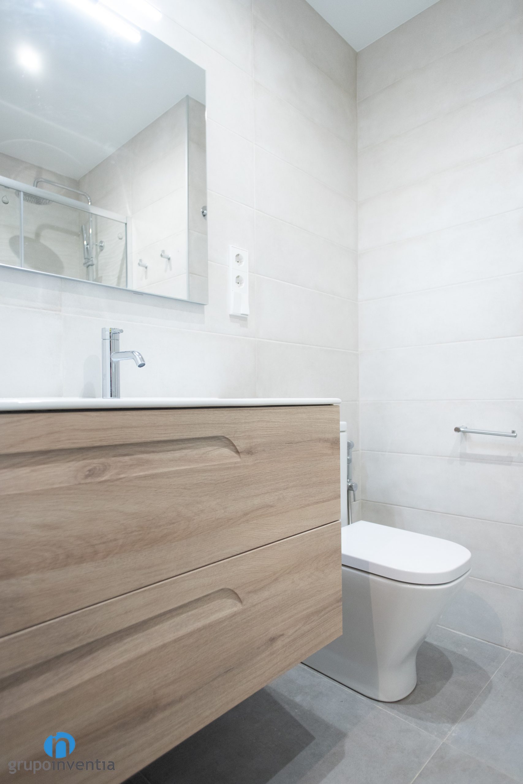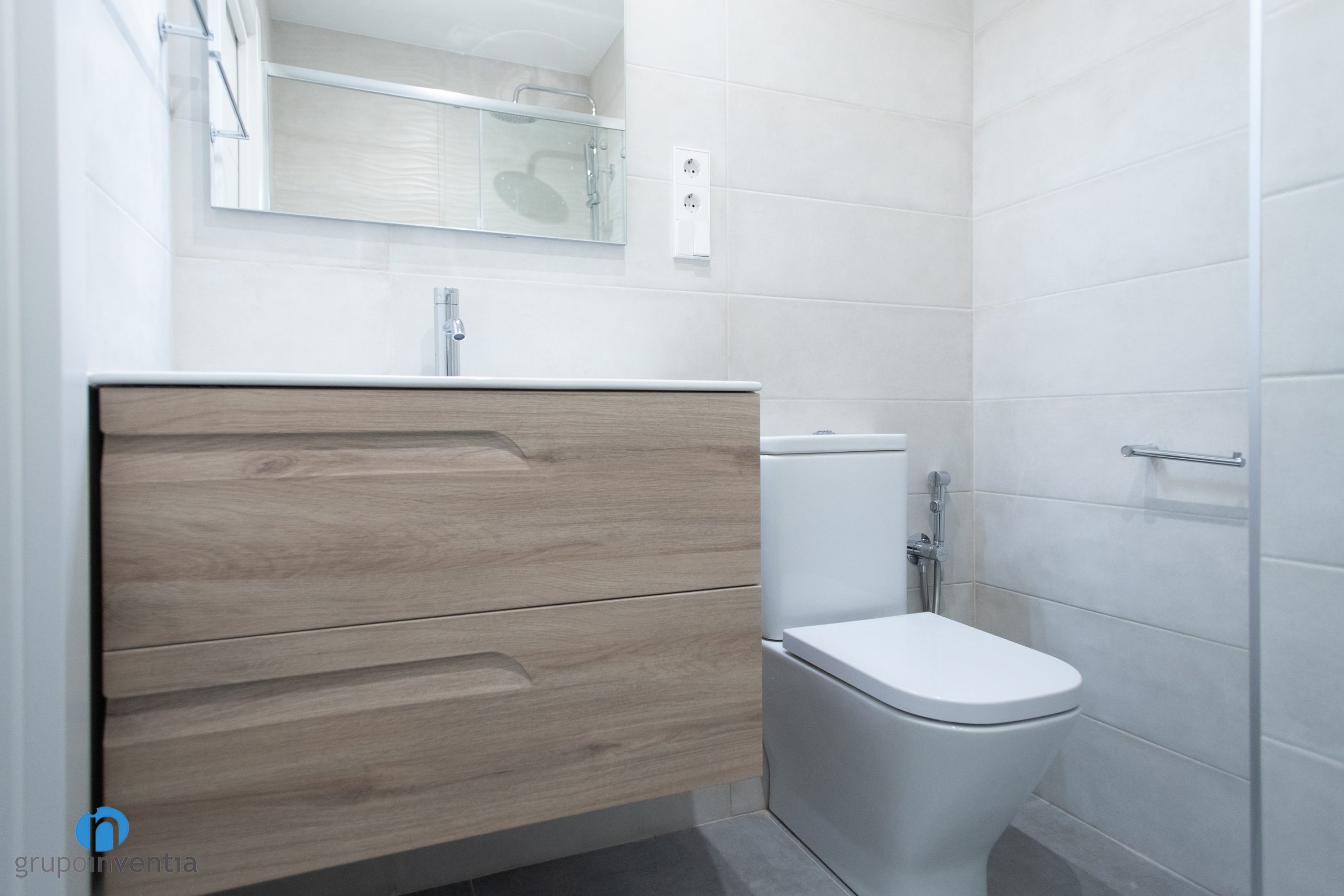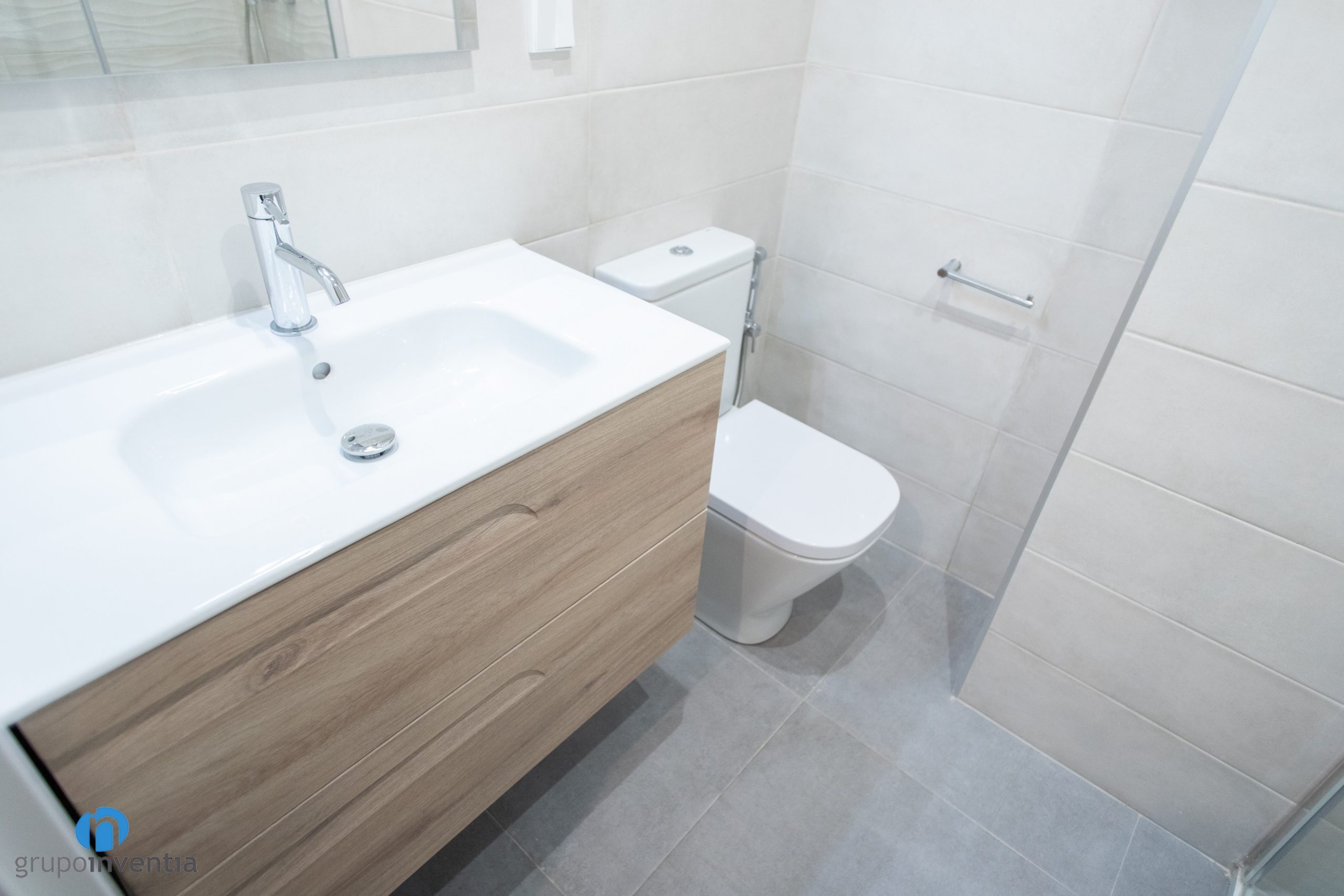 En cuanto a la nueva imagen del baño se ha optado por un diseño neutro y agradable. Para alicatar las paredes se han utilizado baldosas de color beige. De este modo se genera una estancia muy luminosa y visualmente amplia. Este tono neutro permite introducir otros acabados, por ejemplo el mueble de baño presenta acabados en tonos medios de madera. Para el pavimento se ha optado por un suelo de gres en un tono suave de gris.