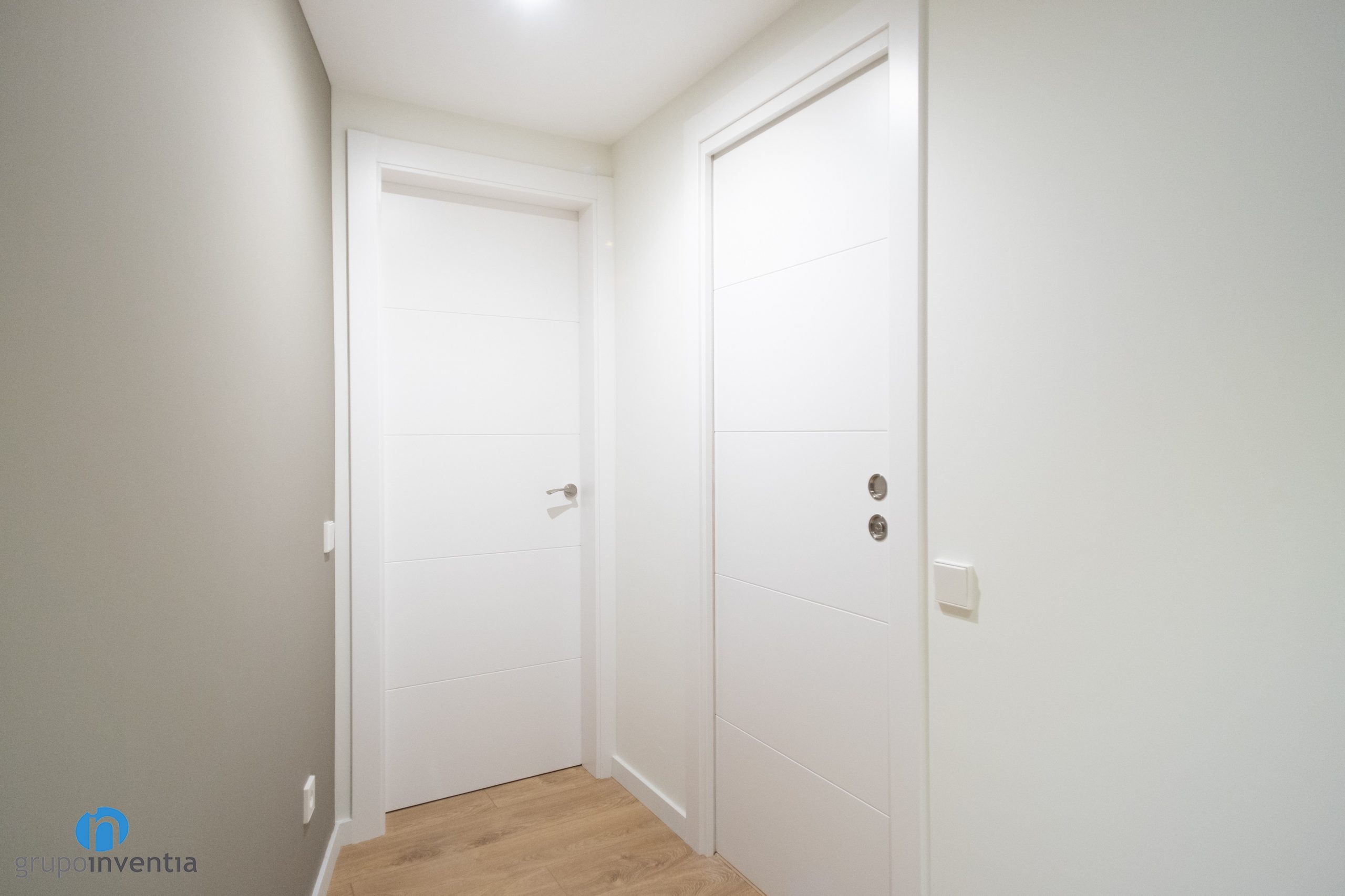 En el recibidor se han combinado dos colores y las paredes se han pintado de color blanco y gris. En el salón, que cuenta con una gran entrada de luz natural, se ha utilizado el color blanco para pintar todas las paredes. Éste se combina con un pavimento de parquet en tonos de madera natural. Se trata de una opción fantástica y que aporta mucha calidez a las estancias. A la hora de escoger el color de los dormitorios ha habido variedad, ya que en algunos se ha mantenido el color blanco, pero en otros se ha utilizado un beige suave.