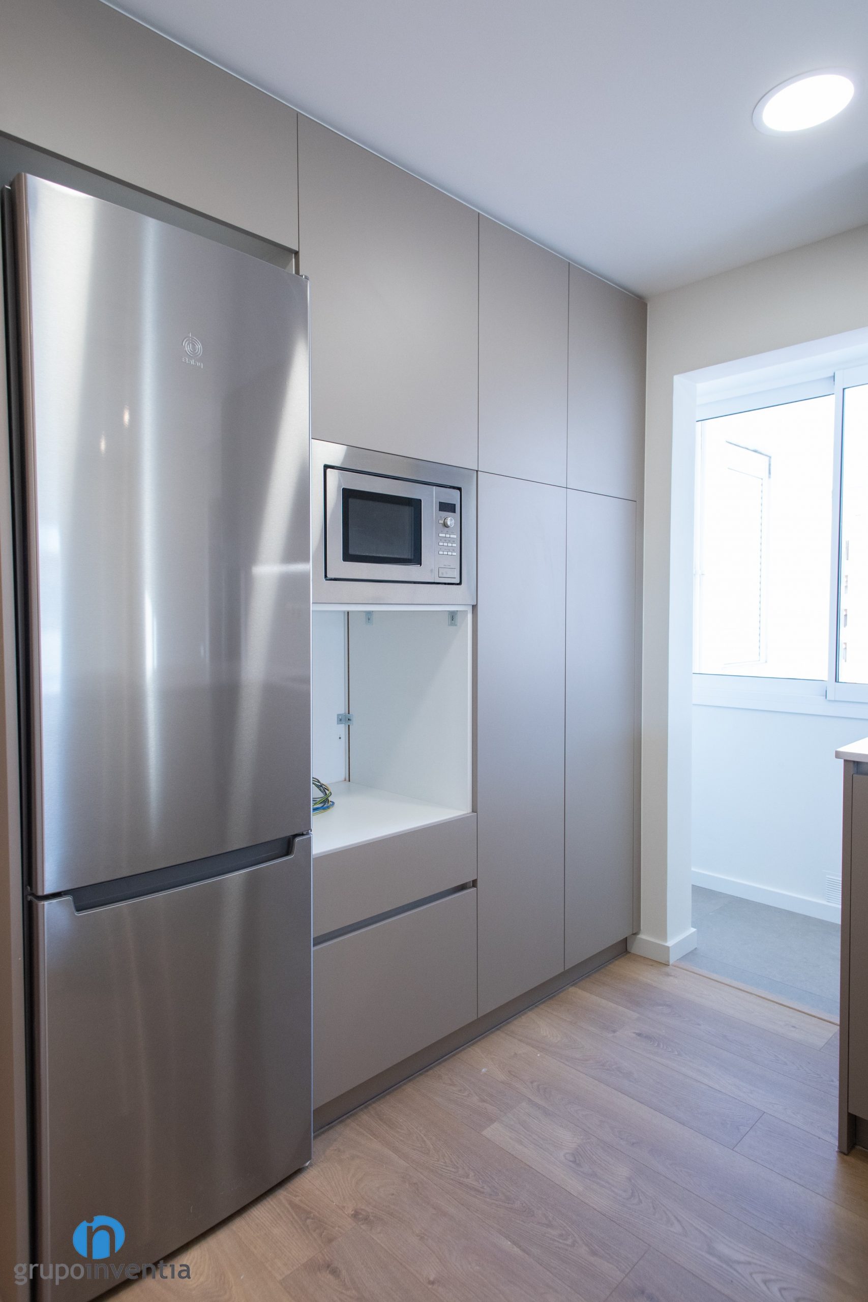 Nos encontramos con una reforma de cocina abierta y distribuida en forma de U. Dada su ubicación esta es la disposición más adecuada y funcional para aprovechar al máximo el espacio disponible. En el lado izquierdo de la cocina se ha dispuesto un gran armario con huecos a medida para integrar los electrodomésticos. Estos son la nevera, el microondas y el horno. Además este armario aporta una gran capacidad de almacenaje a la cocina.