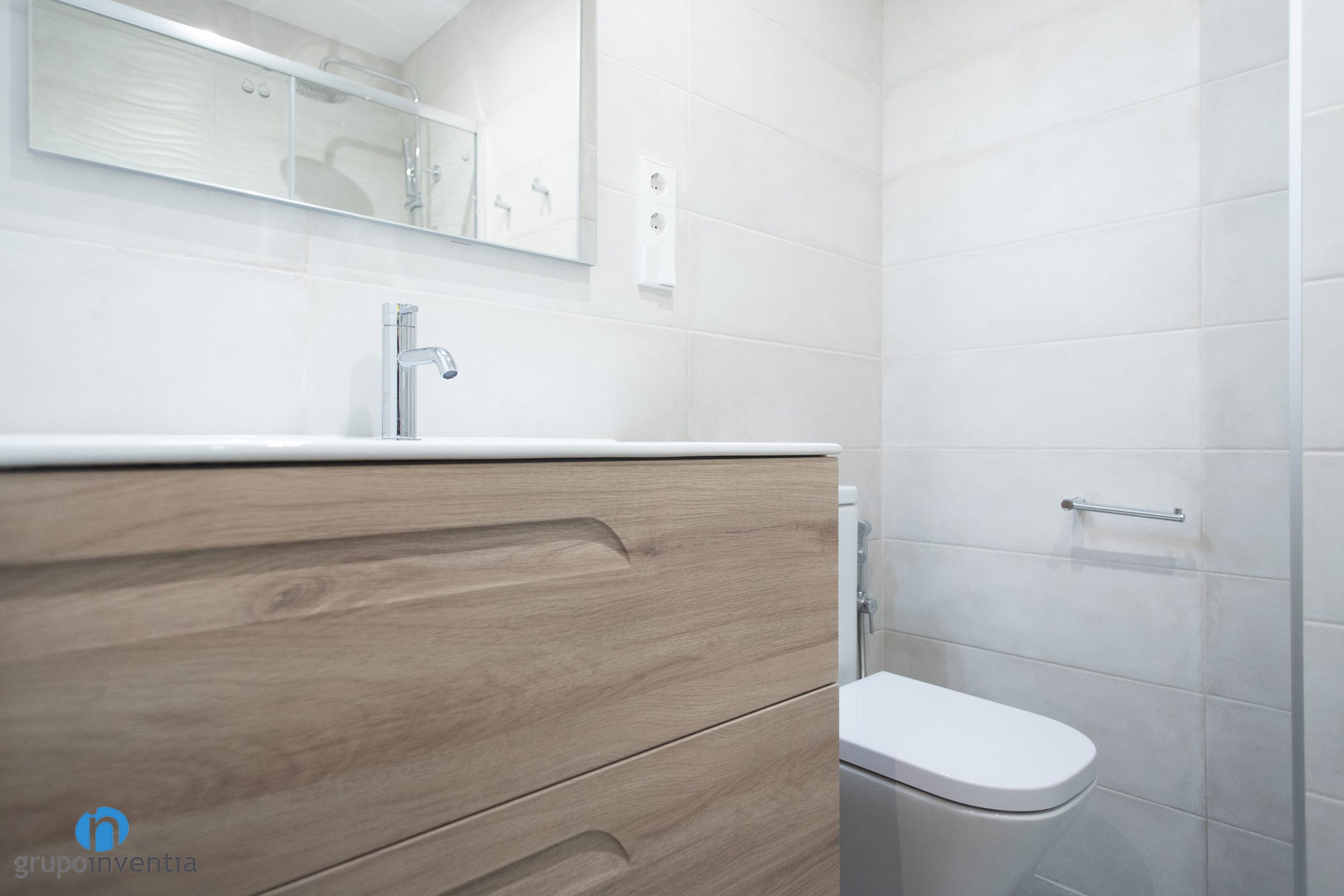 Nuestras reformas integrales implican un trabajo de renovación muy preciso para cada estancia. En este caso el cuarto de baño también se ha mejorado por completo. Ahora esta estancia de uso diario cuenta con un equipamiento sanitario nuevo y funcional. Está compuesto por un lavabo con mueble de almacenaje en su zona inferior, un inodoro y un plato de ducha. Para los cerramiento de éste último se han escogido mamparas de puertas correderas.