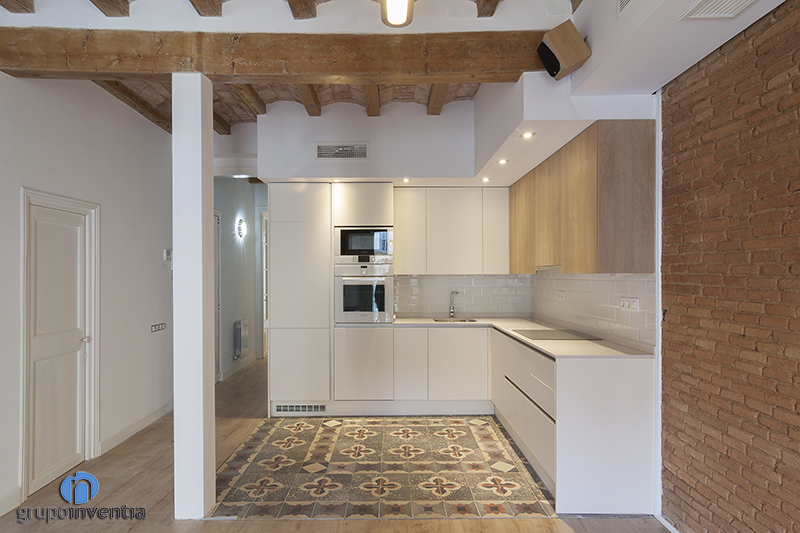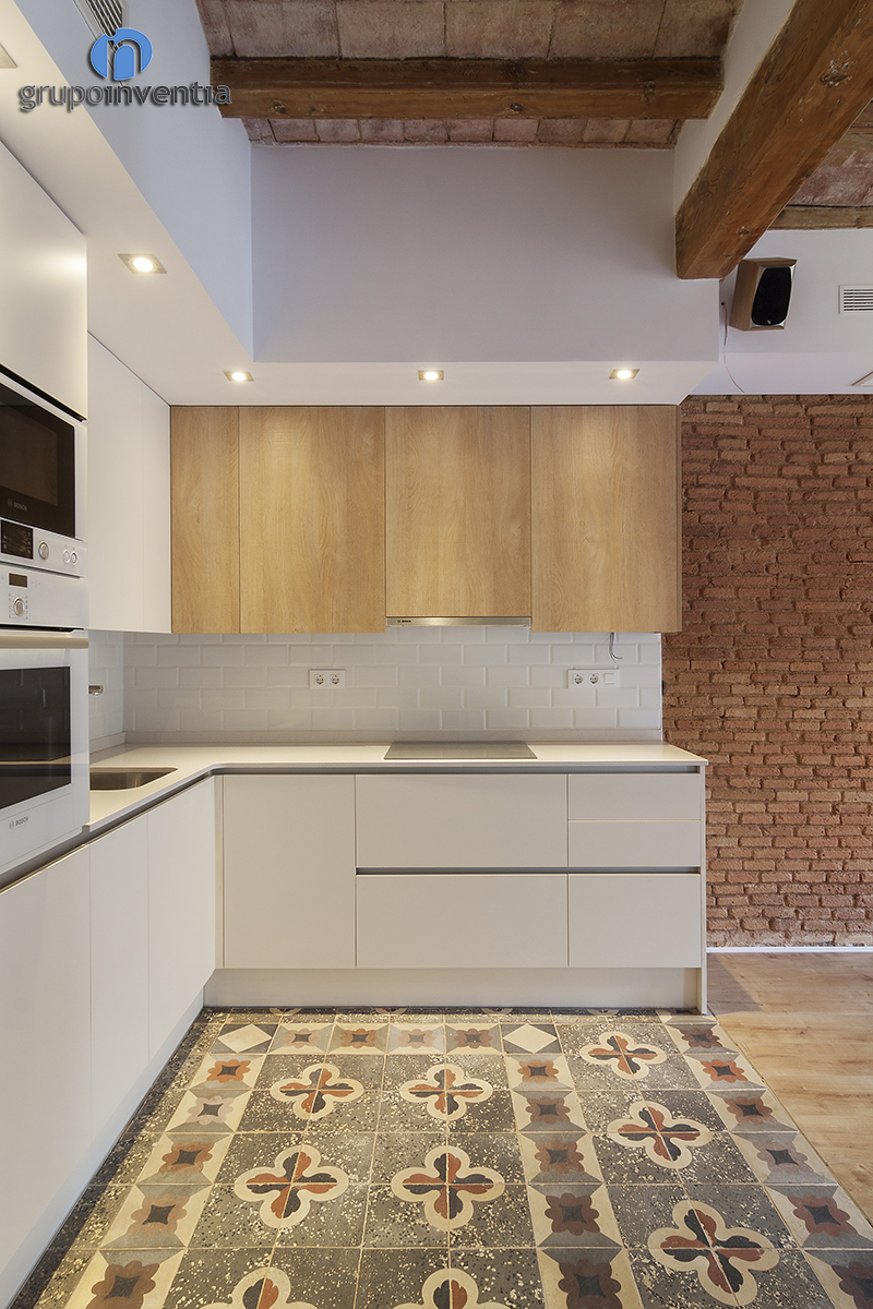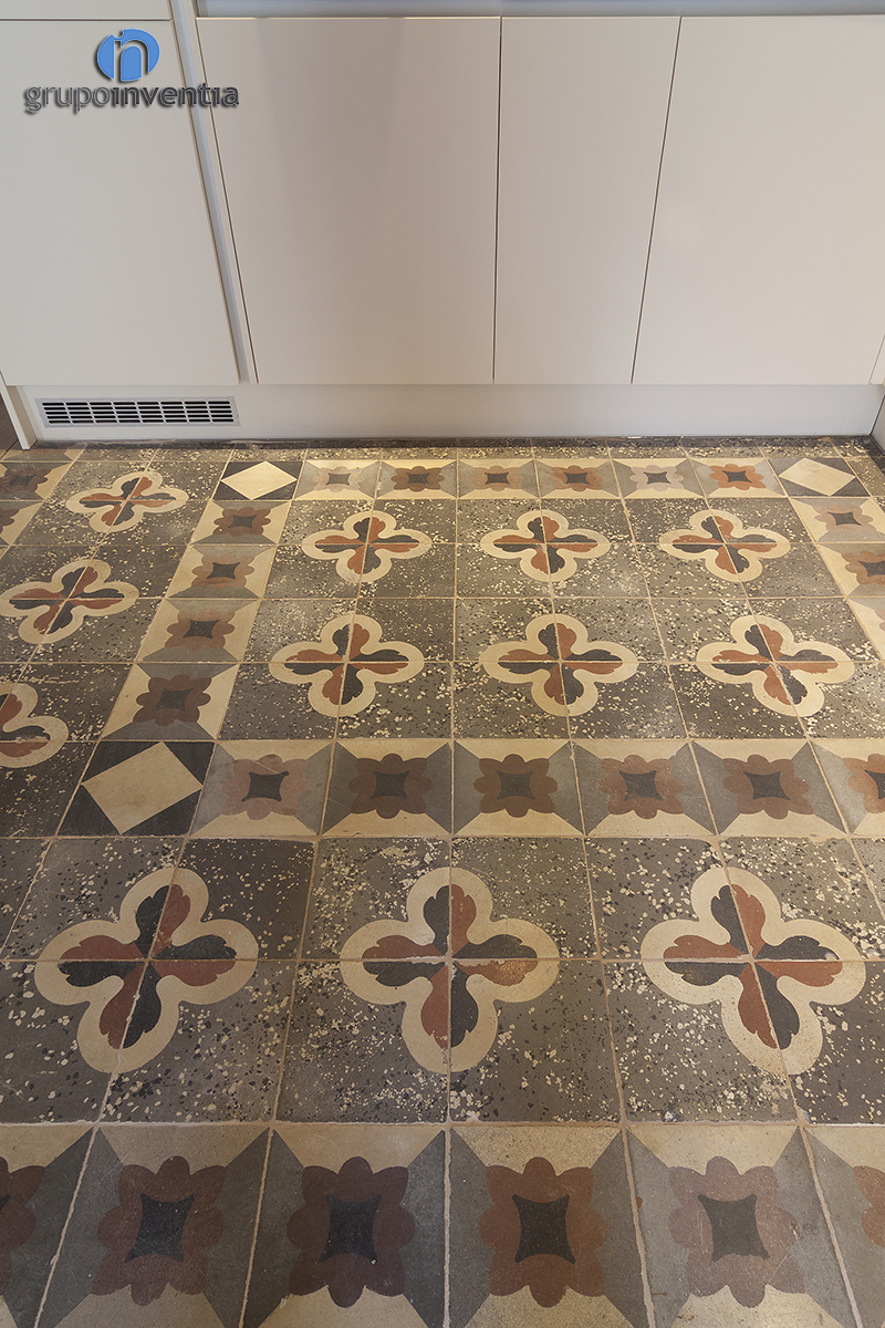 En aspectos más particulares, se debe mencionas la reforma de cocina. Como se ha apuntado, la cocina era abierta al salón, pero se diferenció muy bien su espacio al mantener el pavimento hidráulico original respecto al parquet laminado que se instaló en la mayoría del inmueble. En este caso, se realizó un trabajo de restauración.