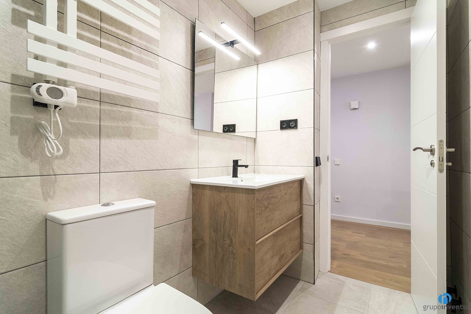 El cuarto de baño también ha sido completamente renovado para ofrecer una experiencia cómoda y moderna. Se ha optado por un diseño limpio y práctico, con sanitarios de líneas rectas y una ducha con mampara de vidrio transparente. La combinación de revestimientos cerámicos en tonos claros y detalles en acabado piedra aporta frescura y estilo.