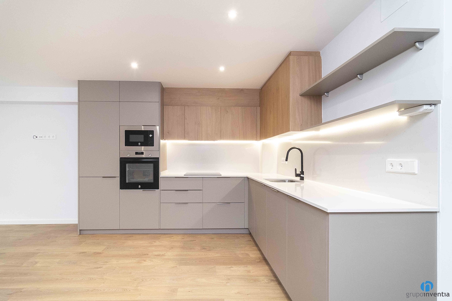 La cocina se presenta como un espacio moderno y totalmente funcional. Se integra en el salón comedor en un formato de planta abierta. Su distribución en forma de L permite aprovechar al máximo el espacio, creando una zona de trabajo cómoda y conectada visualmente con el resto del hogar. El mobiliario inferior luce acabados en tonos neutros, mientras que los armarios superiores aportan calidez con un acabado en madera natural.