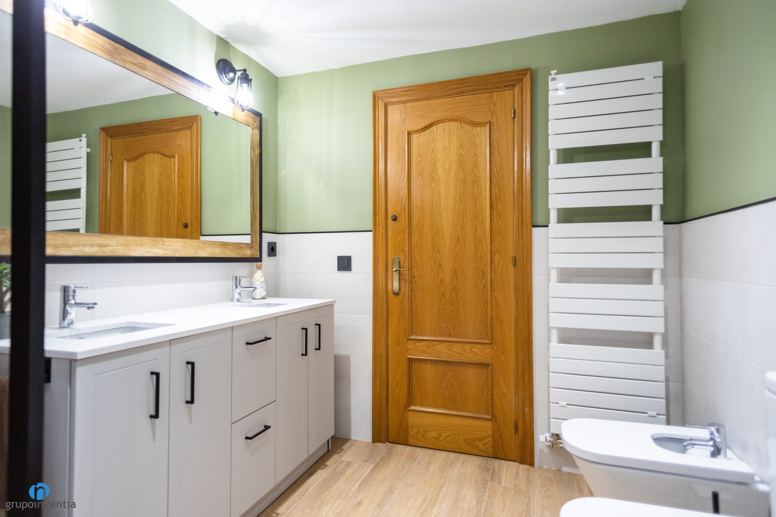 Además del interiorismo del cuarto de baño también se ha instalado un nuevo equipamiento sanitario. Se trata de un espacio muy amplio, por lo que se ha procedido a equiparlo por completo con todo tipo de piezas sanitarias. A la derecha de la entrada se ubica un lavabo doble con un mueble de almacenaje en su zona inferior.