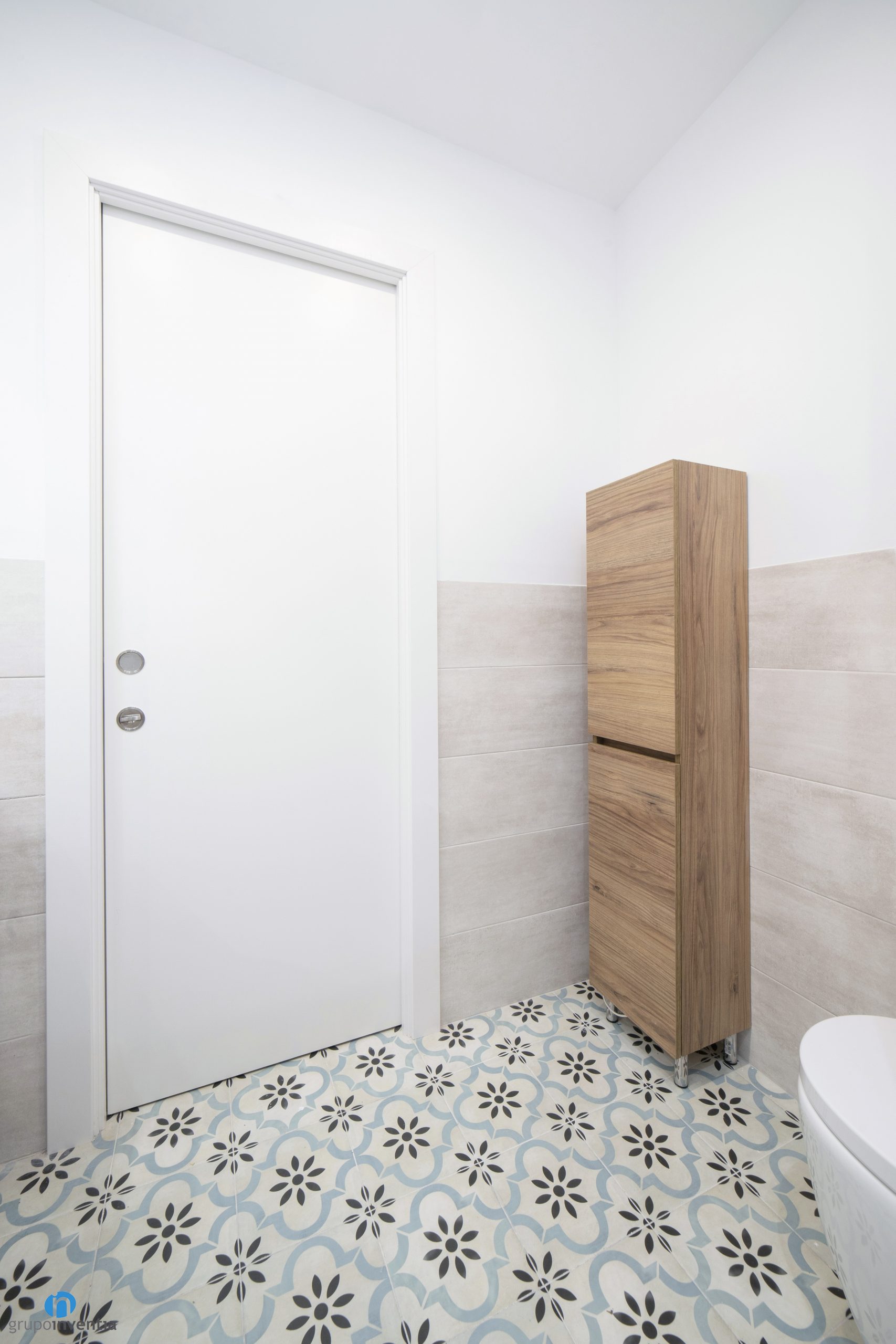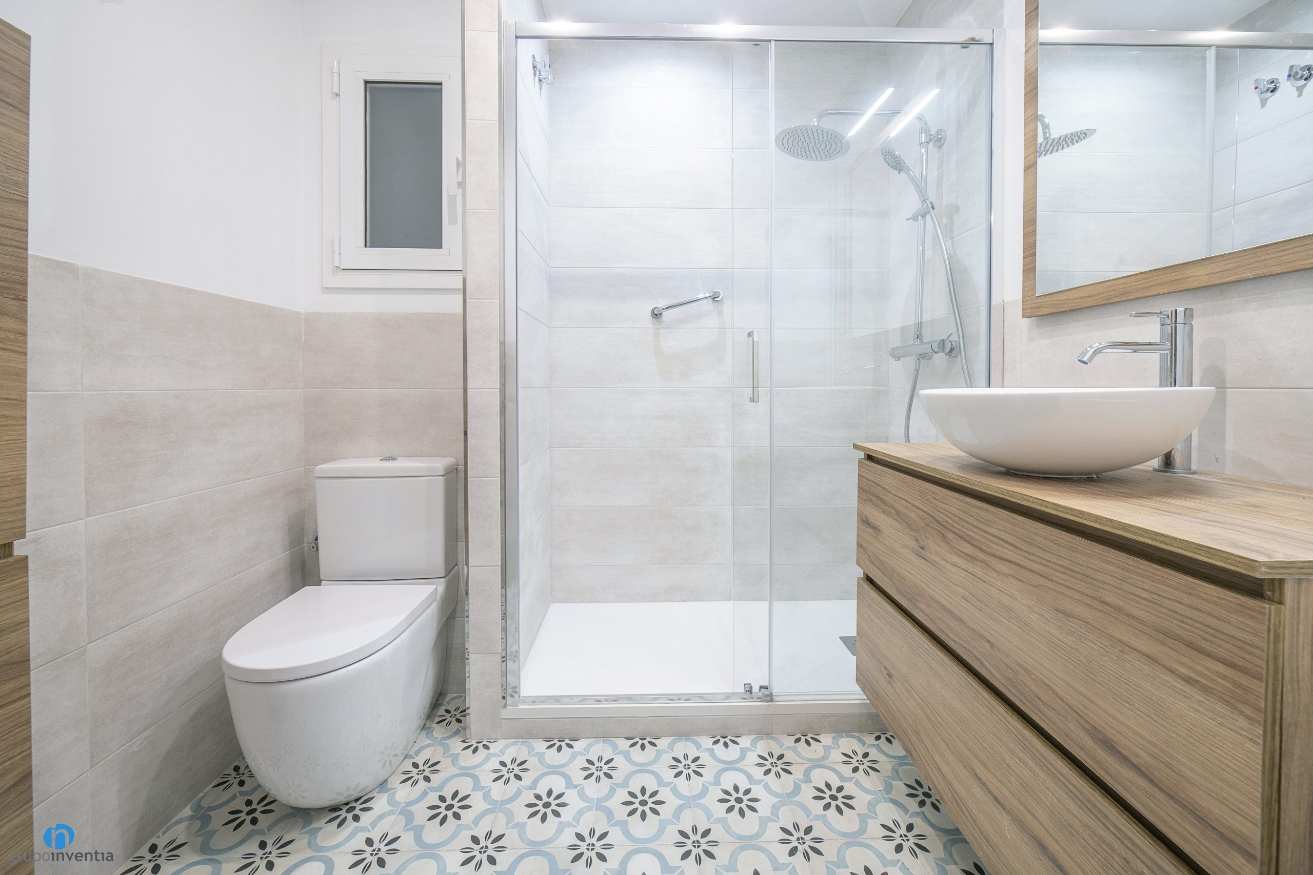 La imagen de esta reforma de baño se completa con un nuevo pavimento. En este caso se ha escogido un suelo cerámico con acabado hidráulico que combina los colores beige y azul. En el aspecto visual es un gran acierto y también a nivel practico. El cuarto de baño necesita un suelo resistente y fácil de limpiar, éste suelo cubre ambas necesidades.
