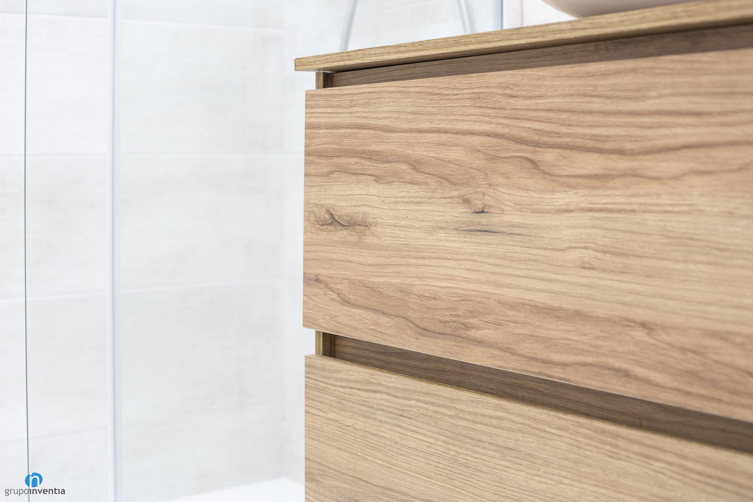 En el lado derecho se ha colocado un lavabo de diseño redondo y ubicado sobre el mueble de baño. Éste cuenta con dos cajones para el almacenaje y contribuye a una correcta organización de la estancia. La capacidad de almacenaje de esta reforma de baño se amplía con un armario vertical anclado a la pared. En este caso ambas piezas presentan acabados en madera.